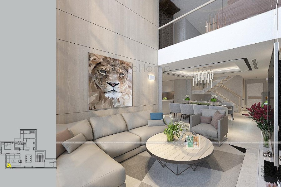 Thiết kế phòng khách thông tầng đang là xu hướng rất được yêu thích hiện nay, đây được xem là lựa chọn thông minh cho những căn hộ có diện tích thu hẹp. Phòng khách thông tầng là một trong những giải pháp thiết kế giúp mở rộng không gian và tăng hiệu quả về mặt công năng sử dụng. Việc sử dụng kính cường lực trong thiết kế giúp tận dụng được tối đa ánh sáng tự nhiên từ bên ngoài, giúp không gian nội thất trở nên mở, sáng và tạo cảm giác cơi nới không gian.