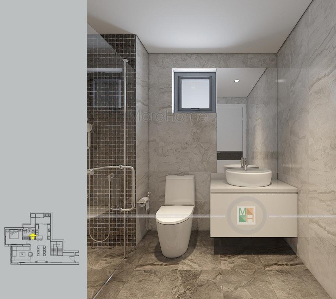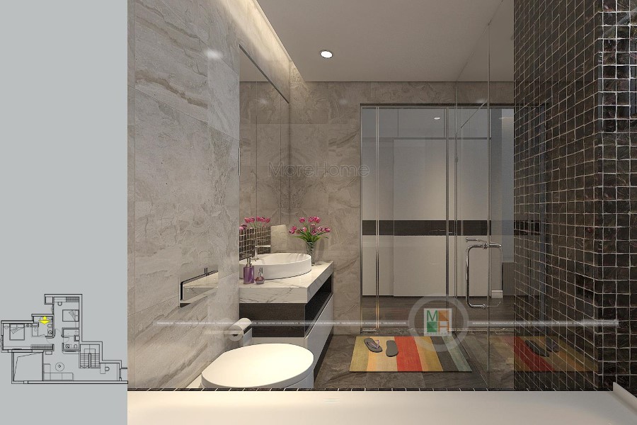 Cuối cùng là thiết kế nhà vệ sinh hiện đại, không gian trở nên đặc biệt mở nhờ việc sử dụng khá nhiều các chi tiết trang trí từ kính cường lực trong suốt, gương phản chiếu đến các vật liệu nhẹ như đá tự nhiên, gạch ốp hoa văn nhẹ nhàng, tinh tế.
