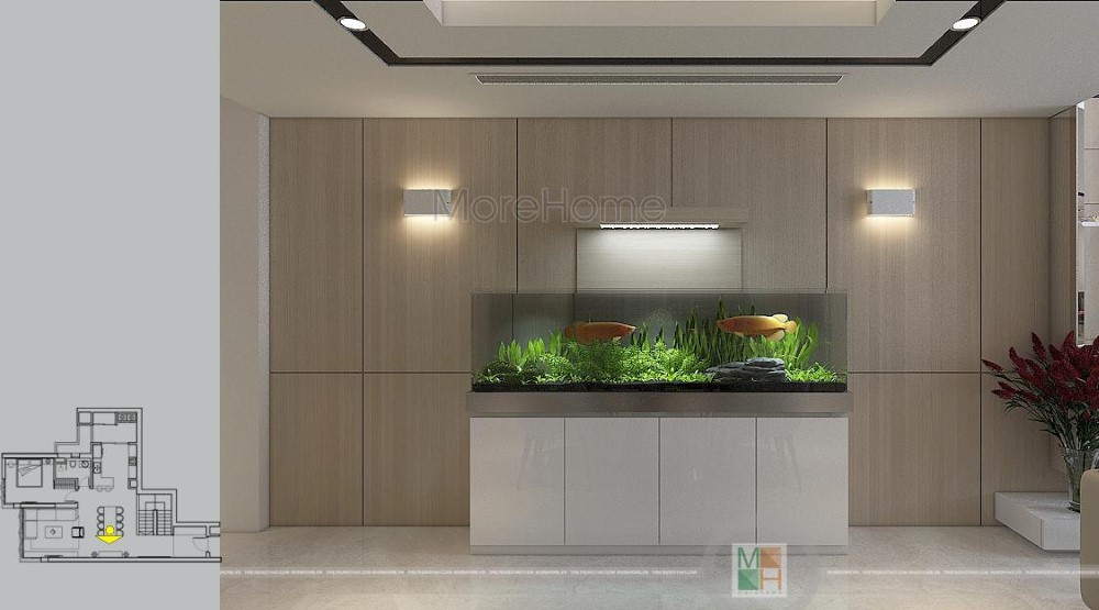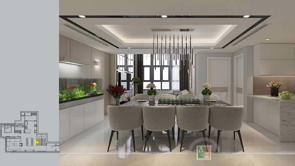 Không gian thiết kế nội thất bàn ăn được đặt ngay liền kề phòng khách tạo không gian liền mạch và thuận tiện cho gia chủ. Thiết kế bàn ăn to rộng phù hợp với nhiều mục đích sử dụng khác nhau của gia chủ. Thiết kế bể cá động góp phần lớn cân bằng và tạo điểm nhấn cho thiết kế.