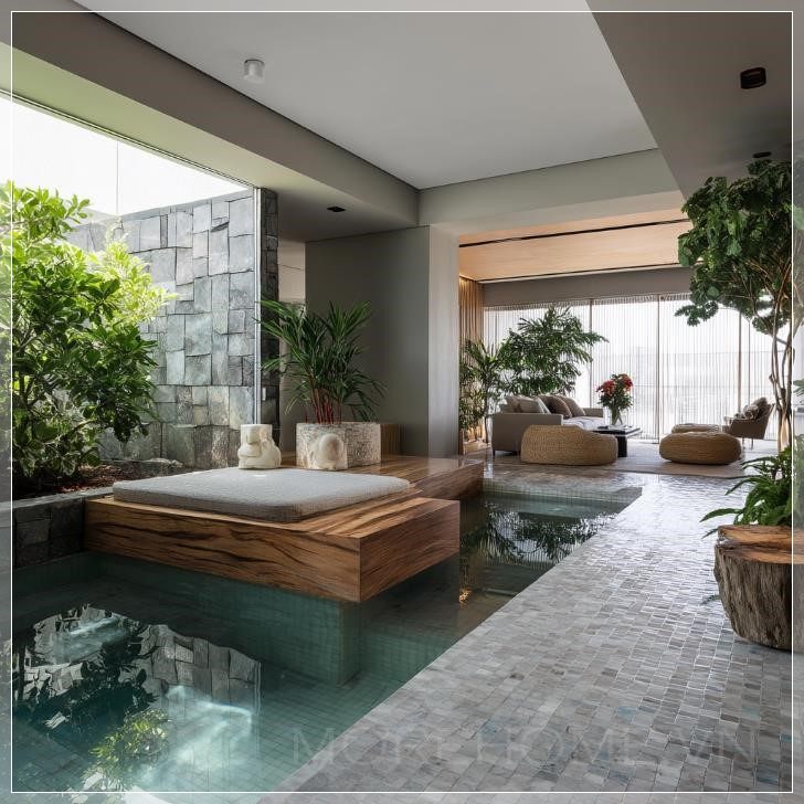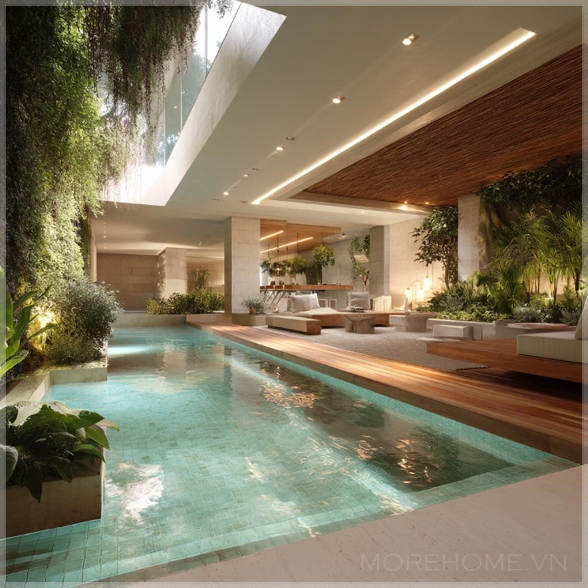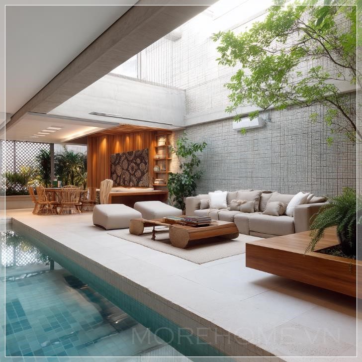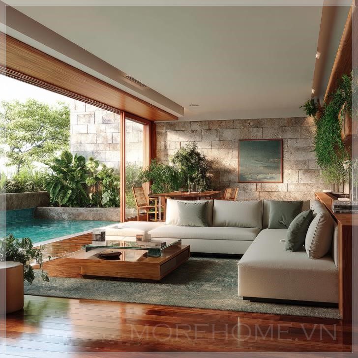 Phòng khách hiện đại, sàn gạch thủy lực với tông màu sáng, vật liệu tự nhiên và sự kết nối hài hòa với khu vườn và hồ bơi. Liên hệ: https://zalo.me/morehomevietnam