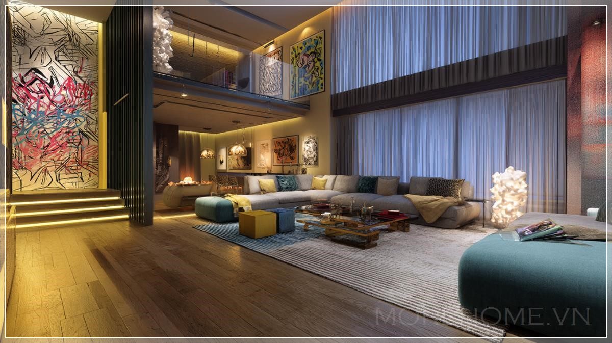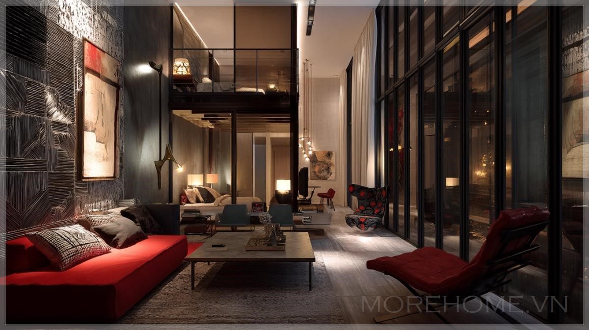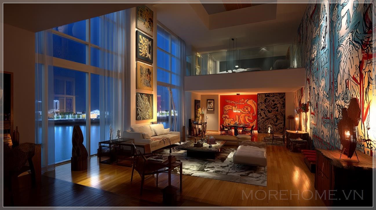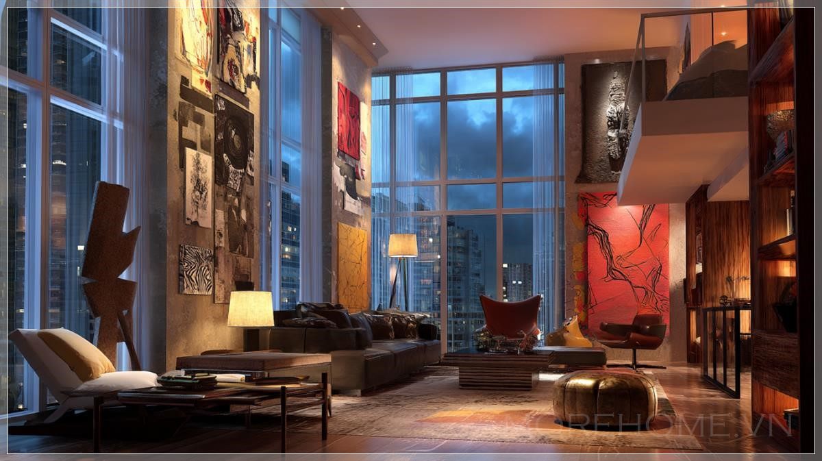 Nội thất phòng khách căn hộ vui nhộn với trần nhà cao gấp đôi, khu vực phòng ngủ tách biệt, các tấm kính lớn nhìn ra dòng sông, tường ốp độc đáo với các tác phẩm nghệ thuật thú vị, đồ nội thất và phụ kiện hiện đại, phong cách và cá tính, ánh sáng ấm áp, sàn gỗ, các chất liệu mềm mại, trang trí điêu khắc, dành cho một người đàn ông độc thân, ngoài 40 tuổi, yêu thích tiệc tùng, chi tiết và điện ảnh.