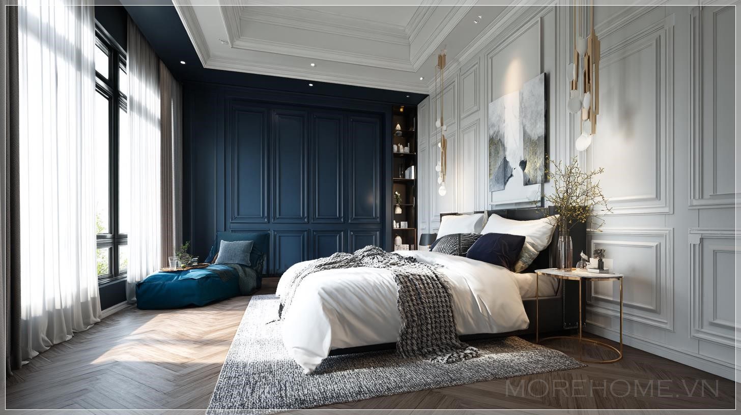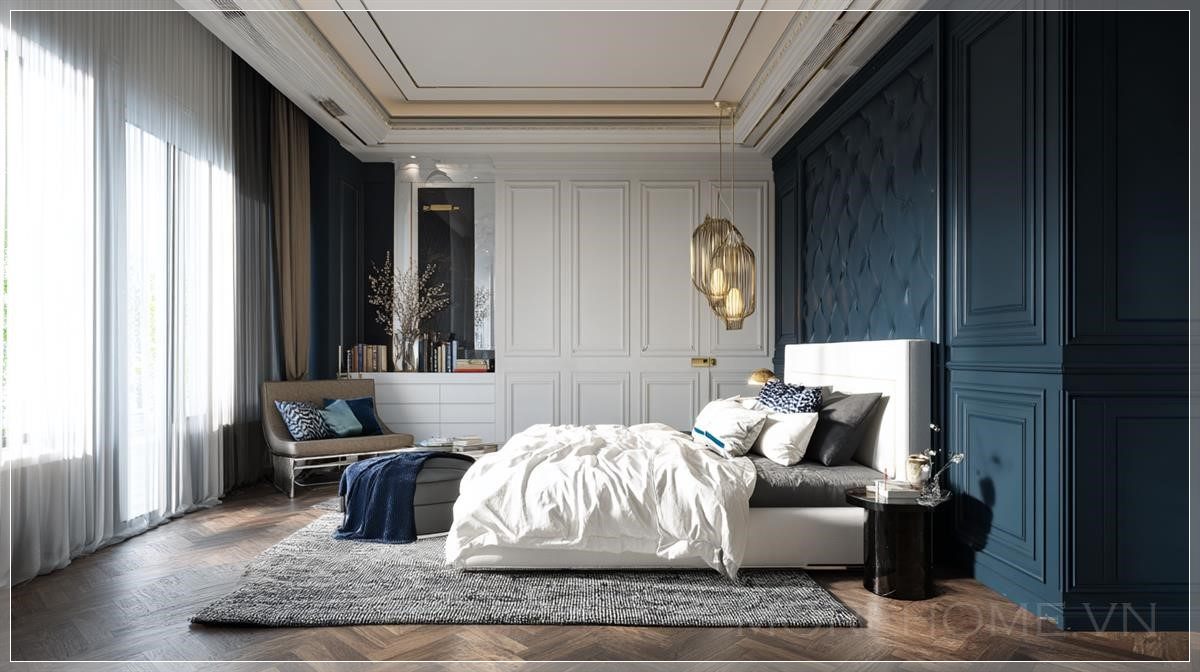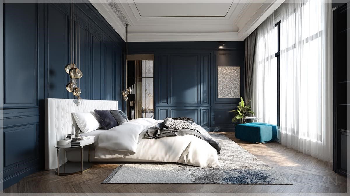 Nội thất phong cách Pháp hiện đại với màu sắc thuần khiết, màu trắng tinh khiết làm màu chủ đạo, các điểm nhấn màu xanh đậm, không gian phòng ngủ biệt thự, hiệu ứng thực tế, ống kính nhìn từ dưới lên, ống kính độ phân giải cao Canon 5D4.