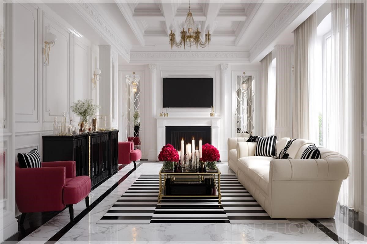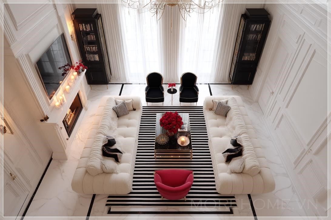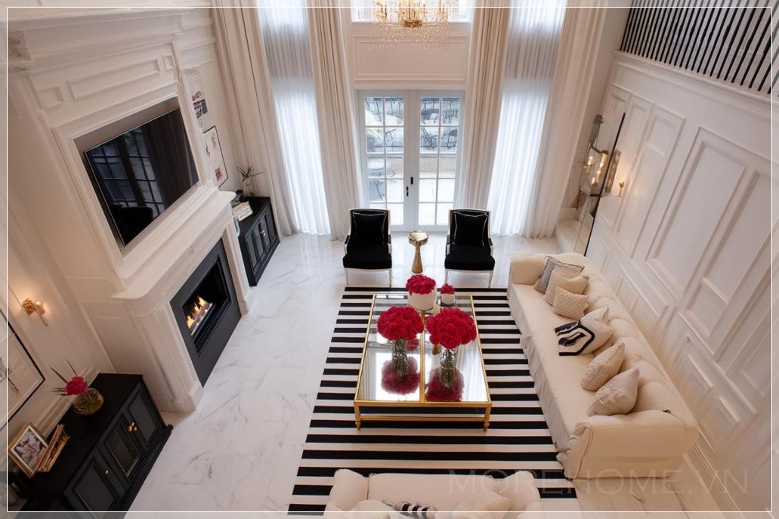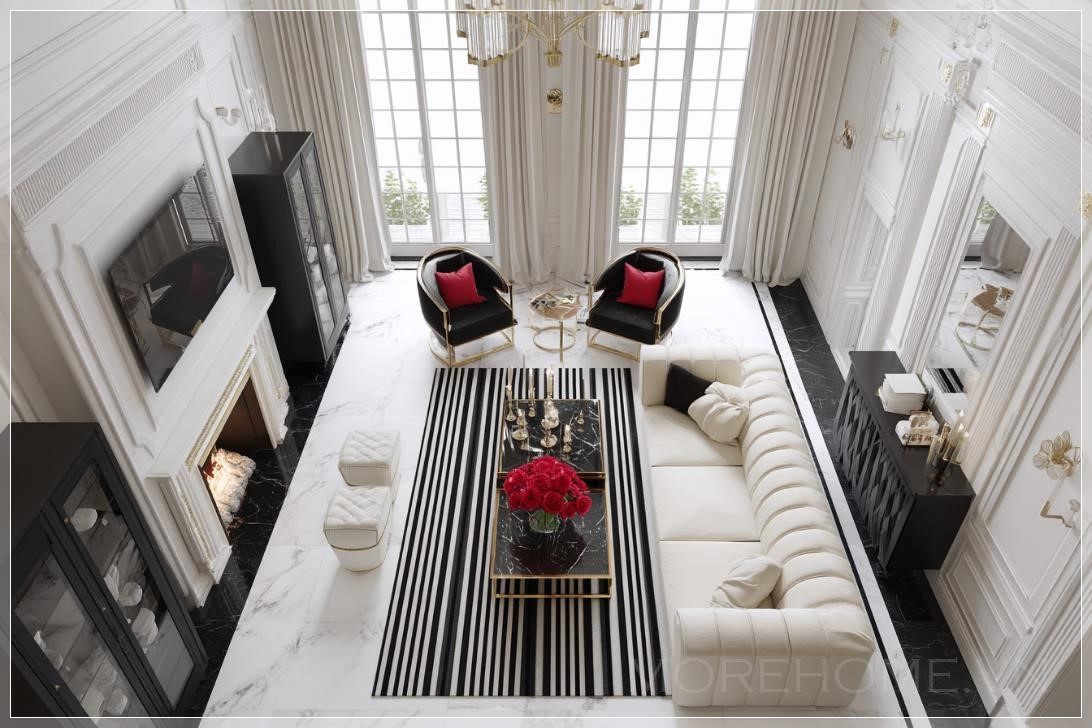 Không gian phòng khách sang trọng theo phong cách hiện đại tân cổ điển, nhìn từ trên xuống, với bố cục đối xứng. Bên trái là một chiếc ghế sofa hình chữ L bọc nhung kem, hai chiếc ghế bành viền đen đặt gần cửa Pháp cao, phía sau. Thảm sọc đen trắng được đặt chính giữa dưới chiếc bàn cà phê kính đen viền vàng, trên bàn có hoa hồng đỏ và nến. Trên tường phía bên phải là một lò sưởi giả màu trắng, phía trên là một chiếc TV màn hình phẳng, hai tủ cao sơn đen bóng với tay cầm vàng đặt ở hai bên. Mặt tường có phào chỉ và tấm ván trang trí màu trắng, đèn chùm được nhìn thấy từ trên cao, chi tiết trần nhà có các khe cọc, sàn đá cẩm thạch đen trắng sáng bóng, rèm Pháp mỏng để ánh sáng tự nhiên chiếu vào.