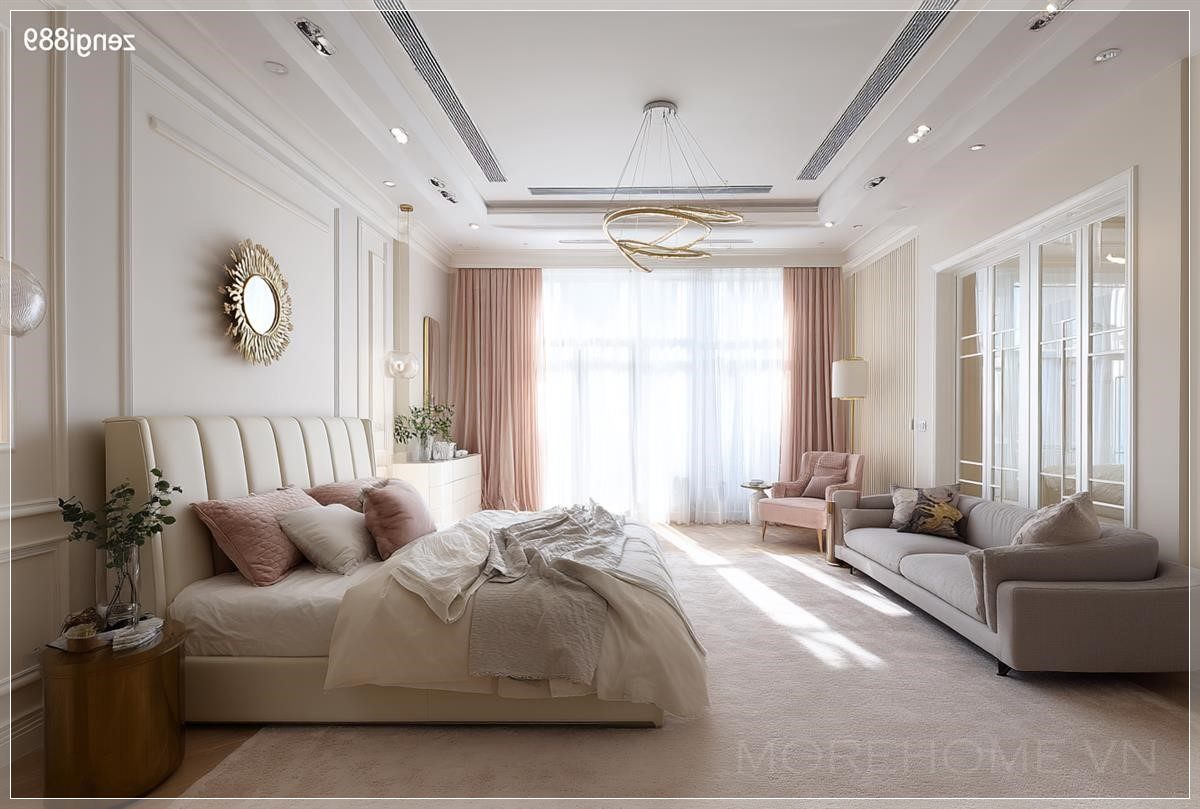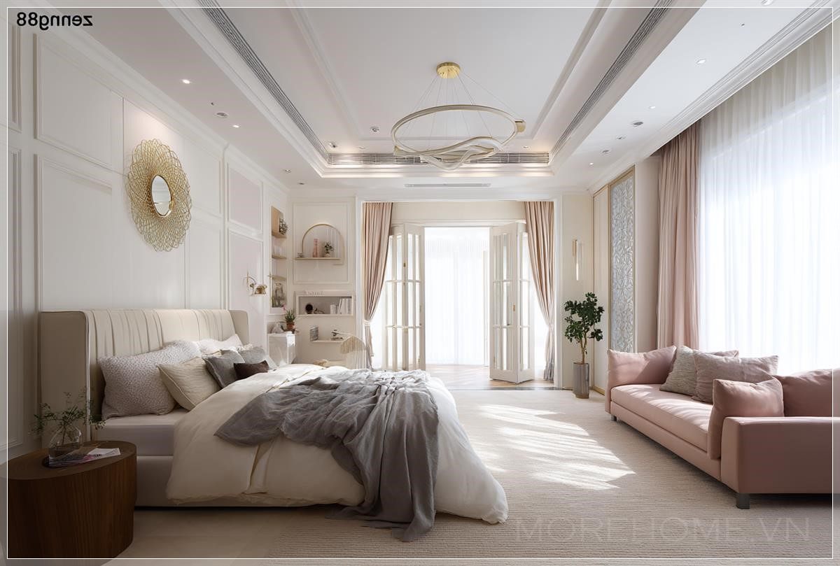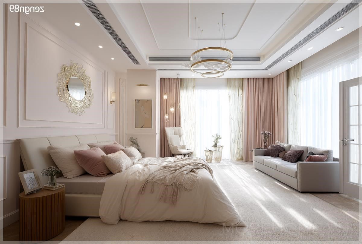 Phòng ngủ biệt thự với tường trắng và trần nhà màu be, thiết kế theo phong cách xa xỉ nhẹ nhàng và rộng rãi. Một tấm thảm mềm phủ trên sàn nhà. Trước đầu giường là một chiếc sofa vải màu xám. Tường được trang trí với các đường gờ mảng tường tinh tế và một chiếc gương trang trí. Một chiếc đèn chùm tròn treo từ trần nhà, mang đến vẻ đẹp hiện đại thanh lịch. Cửa sổ từ sàn đến trần với kính trong suốt và rèm mềm cho phép ánh sáng tự nhiên chiếu vào. Màu sắc tổng thể bao gồm các tông màu hồng nhạt, vàng nhạt và ngà. Một bàn phụ bằng gỗ đặt bên cạnh sofa. Tiêu đề zencing89 xuất hiện ở góc trên bên phải.