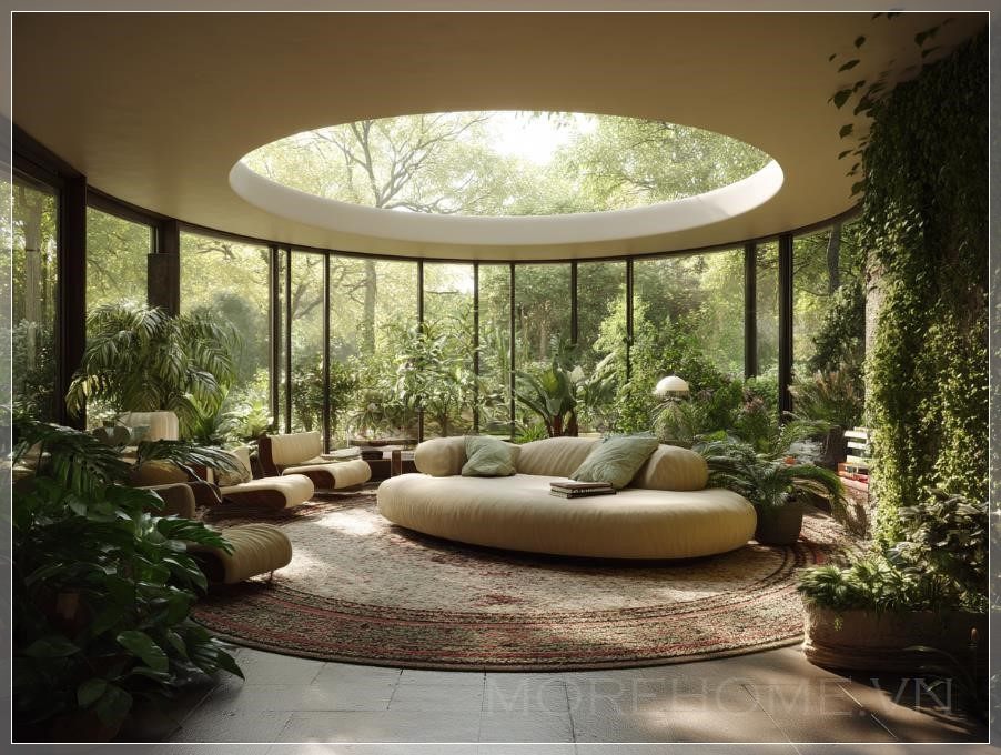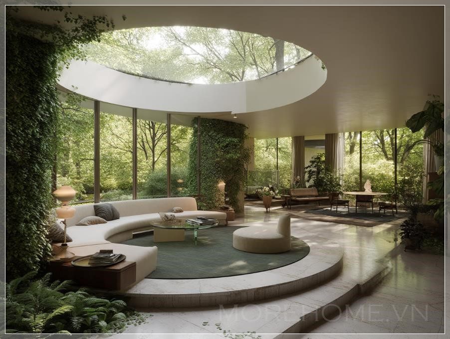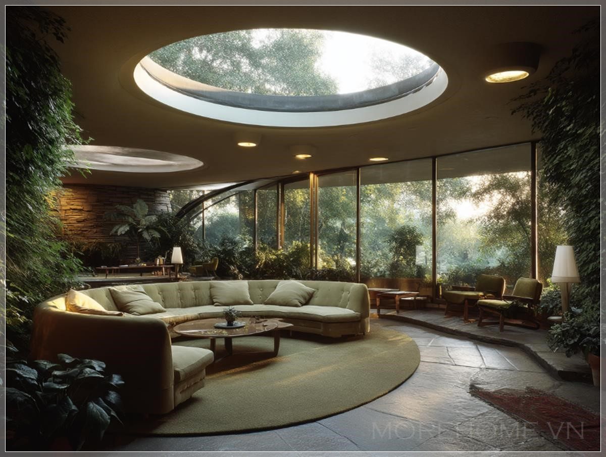 Phòng khách hình tròn với cửa sổ lớn và cây xanh bao quanh, thiết kế bởi Eero Saarinen. Một chiếc sofa tròn được đặt ở trung tâm, tạo điểm nhấn cho không gian. Kế hoạch mặt sàn hình tròn bao gồm nhiều khu vực ngồi, mang đến sự linh hoạt trong việc sử dụng không gian. Cây xanh tươi tốt có thể nhìn thấy qua các cửa sổ, tạo cảm giác gần gũi với thiên nhiên. Ánh sáng tự nhiên từ một ô cửa sổ trên trần chiếu sáng không gian, mang đến bầu không khí ấm cúng và dễ chịu.