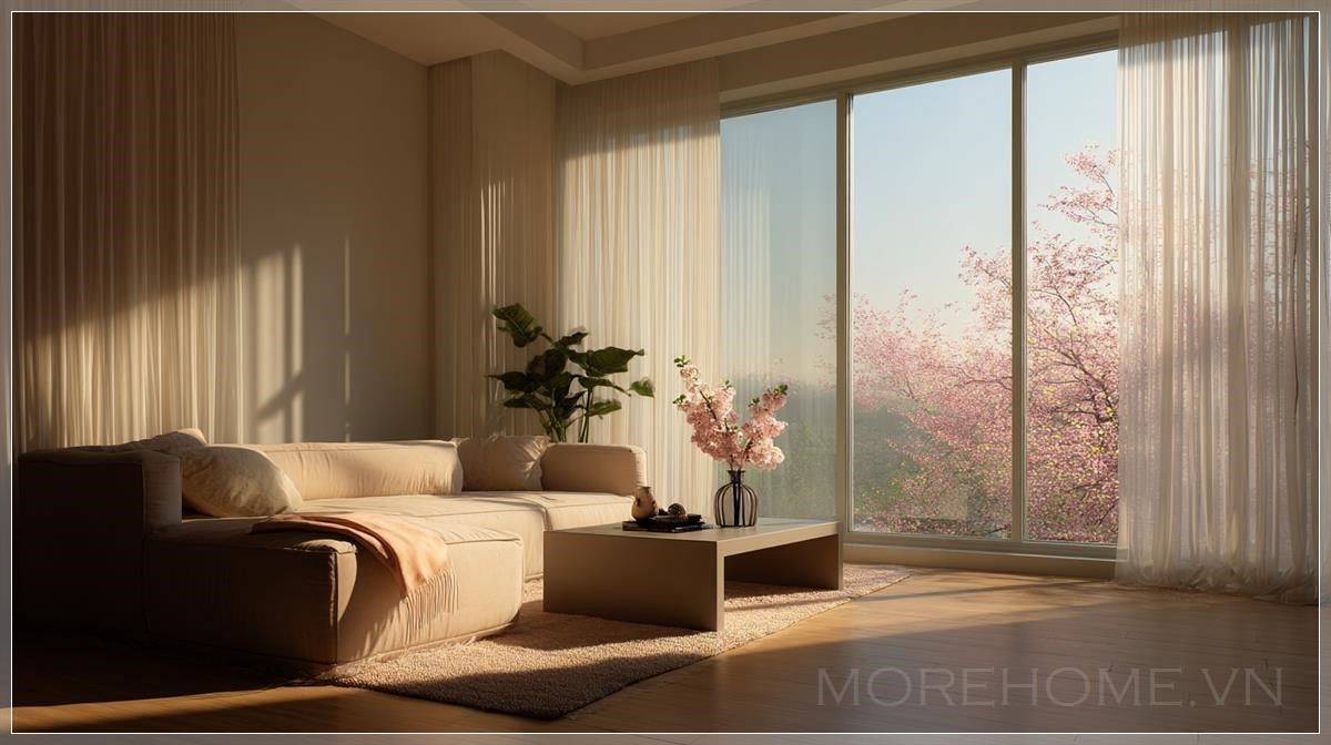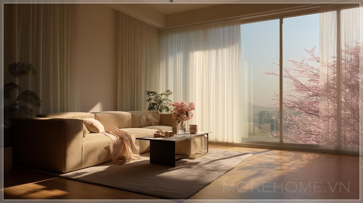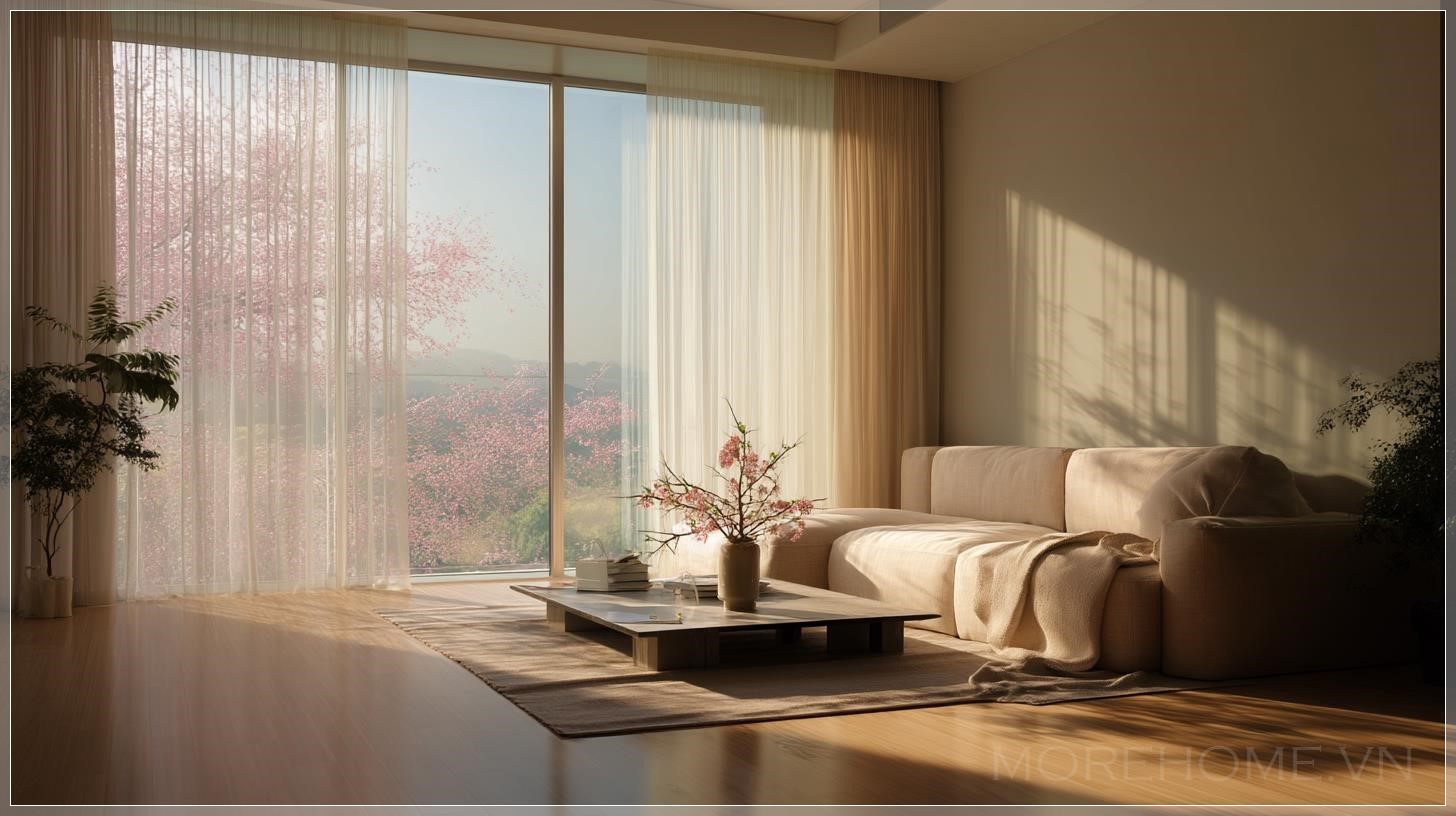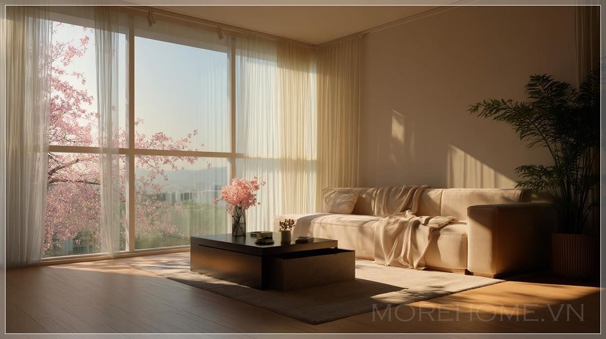 Bên ngoài cửa sổ, những cánh hoa anh đào đang nở rộ, tạo nên một cảnh quan tuyệt đẹp, đồng thời góp phần làm cho không gian thêm phần sống động và tươi tắn. Màu sắc pastel nhẹ nhàng, từ những chi tiết nhỏ như gối tựa cho đến màu sắc tường và đồ đạc, hòa quyện với ánh sáng tự nhiên, mang đến một không khí thoáng đãng và trong lành. Từng tia nắng xuân nhẹ nhàng chiếu qua khung cửa sổ, càng làm cho không gian này thêm phần ấm áp và gần gũi.