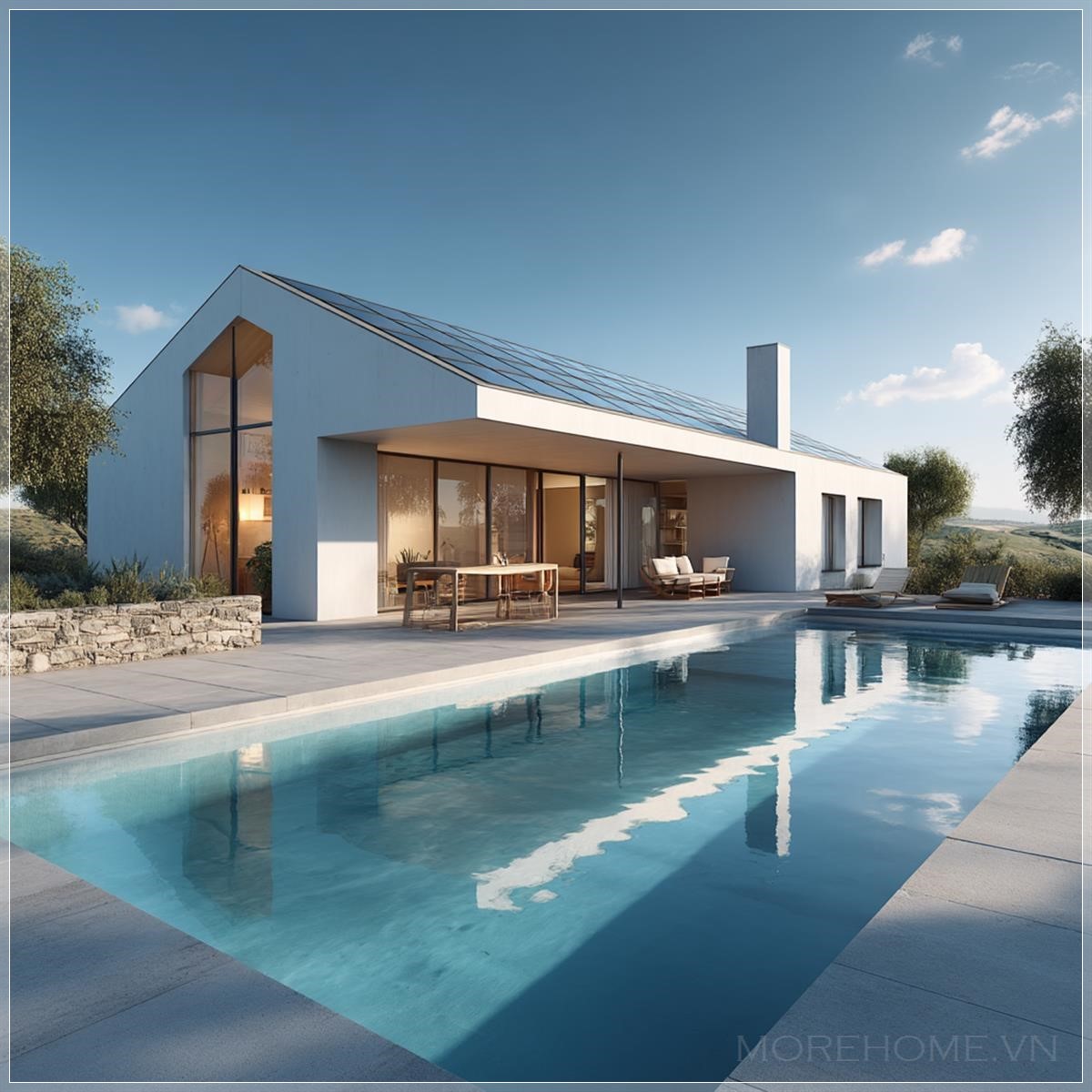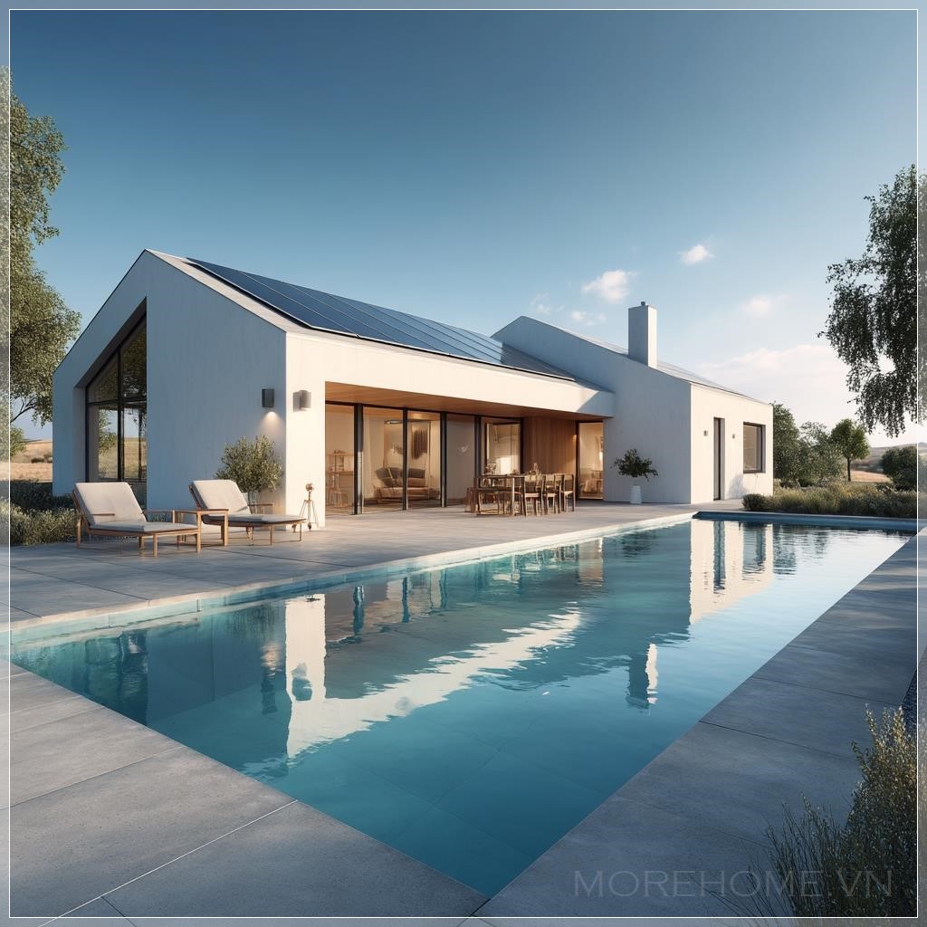 Điểm nhấn nổi bật nhất của ngôi nhà chính là hệ thống tấm pin năng lượng mặt trời được bố trí khéo léo trên mái phẳng. Dưới ánh nắng mùa hè, những tấm pin phản chiếu ánh sáng tạo nên một hiệu ứng thị giác đẹp mắt, đồng thời khẳng định cam kết với lối sống thân thiện với môi trường. Không chỉ đơn thuần là một giải pháp năng lượng, hệ thống này còn là một phần của thẩm mỹ tổng thể, minh chứng rằng công nghệ và thiết kế có thể hòa quyện một cách hoàn hảo.