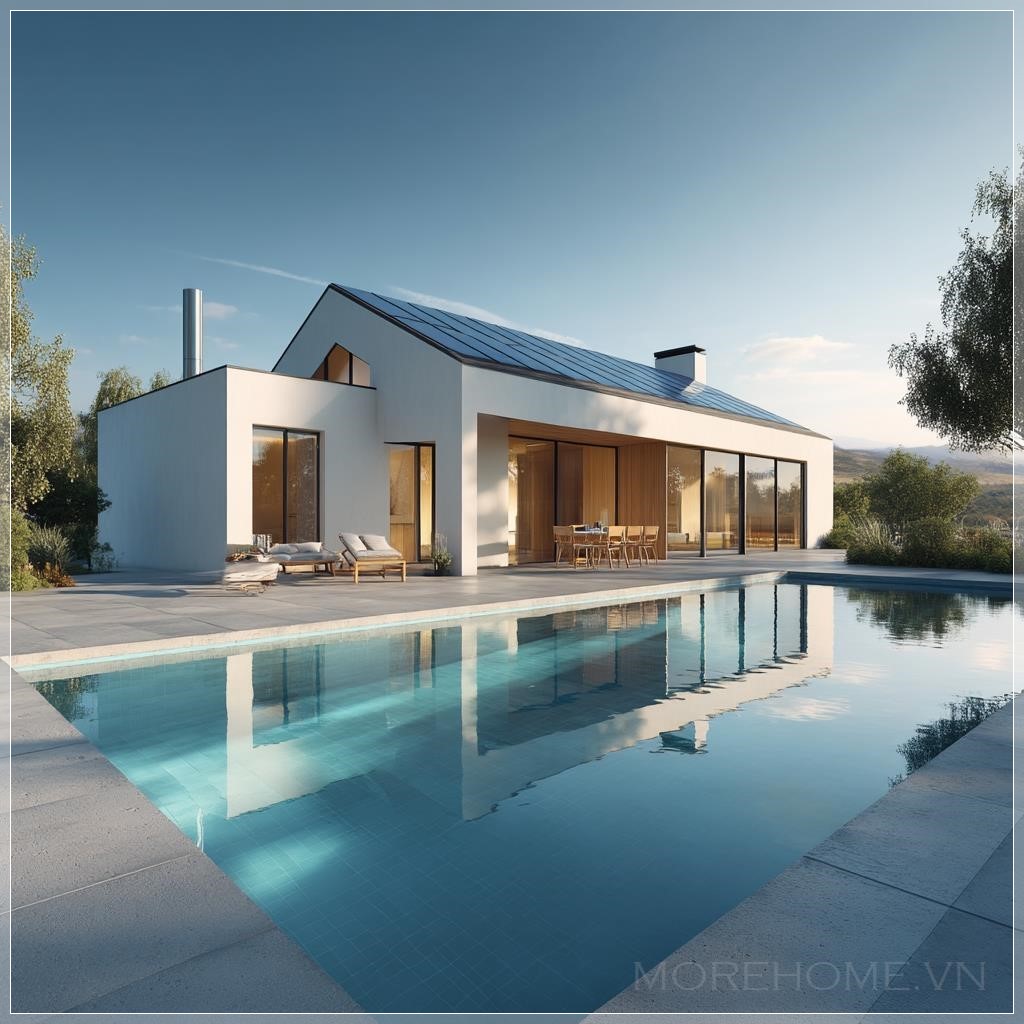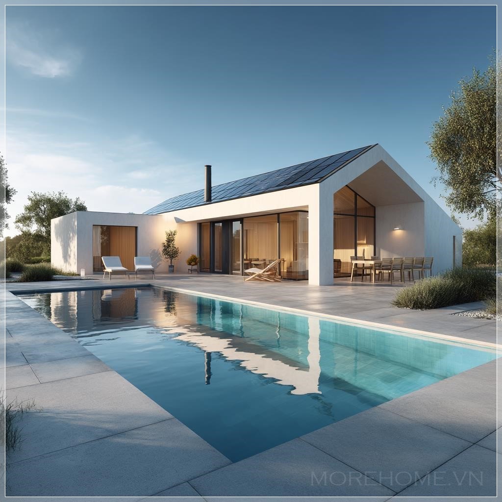 Khi ánh nắng chiều dần buông xuống, ngôi nhà dường như chuyển mình. Những tấm pin năng lượng mặt trời thu nhận những tia nắng cuối cùng của ngày, trong khi ánh sáng dịu nhẹ bắt đầu tỏa ra từ bên trong, tạo nên một ngọn hải đăng ấm áp giữa không gian xanh. Đó là khoảnh khắc mà công nghệ, thiết kế và thiên nhiên hòa quyện trong một bản hòa tấu hoàn hảo.
