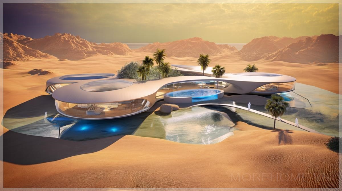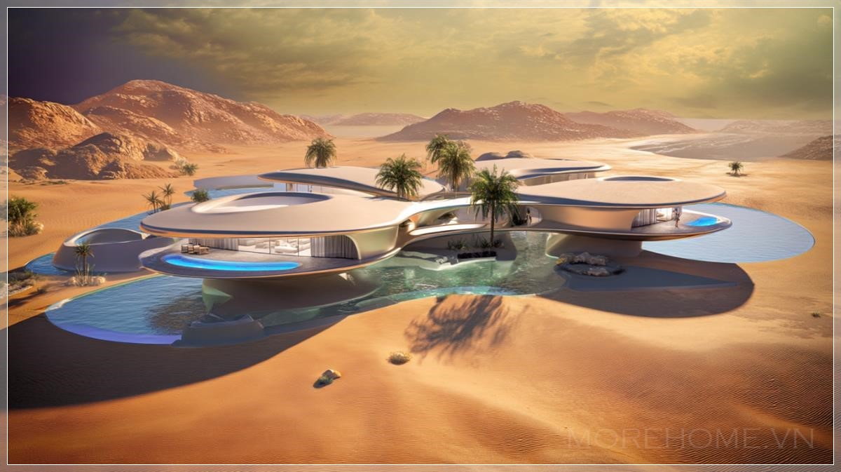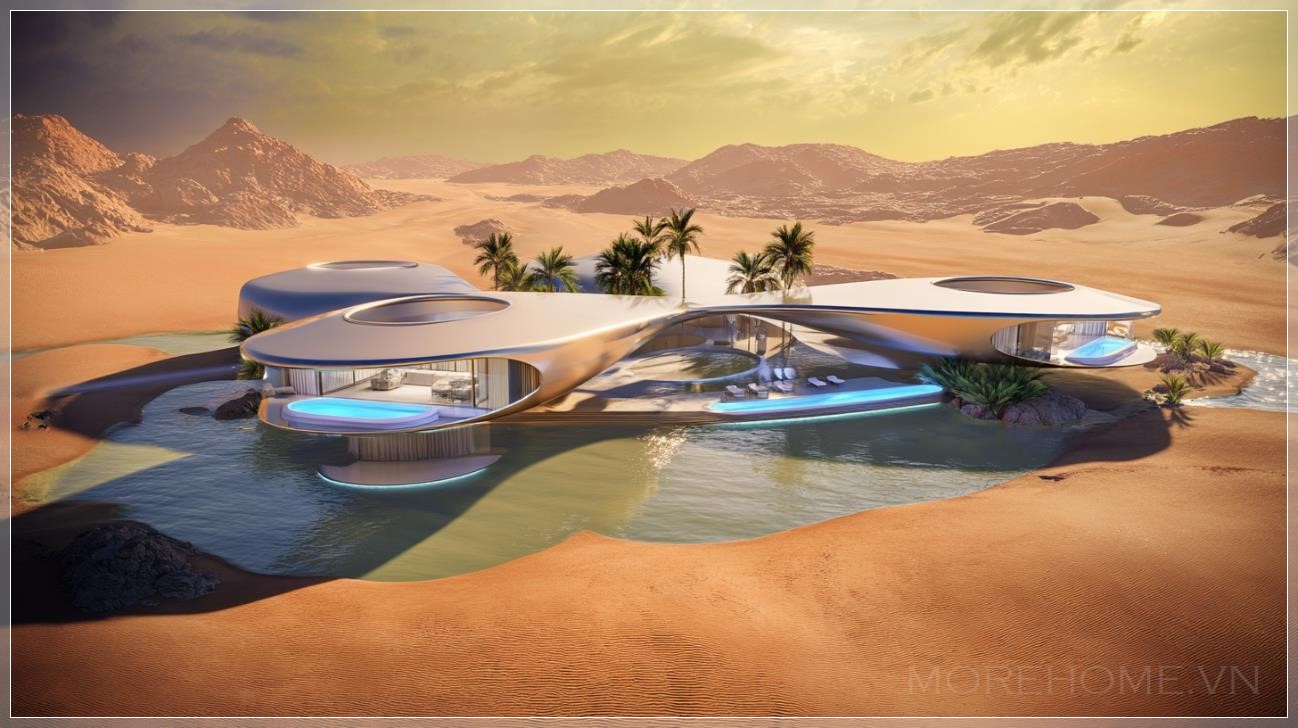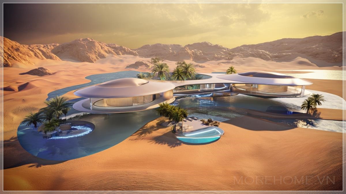 Những đường cong khí động học của từng biệt thự không chỉ đẹp mắt mà còn thể hiện sự hòa quyện hoàn hảo giữa sự đổi mới táo bạo và chủ nghĩa tối giản hữu cơ. Mỗi villa như một con tàu vũ trụ đã hạ cánh nhẹ nhàng xuống sa mạc, với những bề mặt trơn tru phản chiếu ánh sáng vàng óng của hoàng hôn sa mạc.