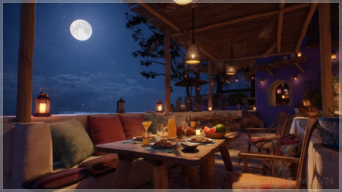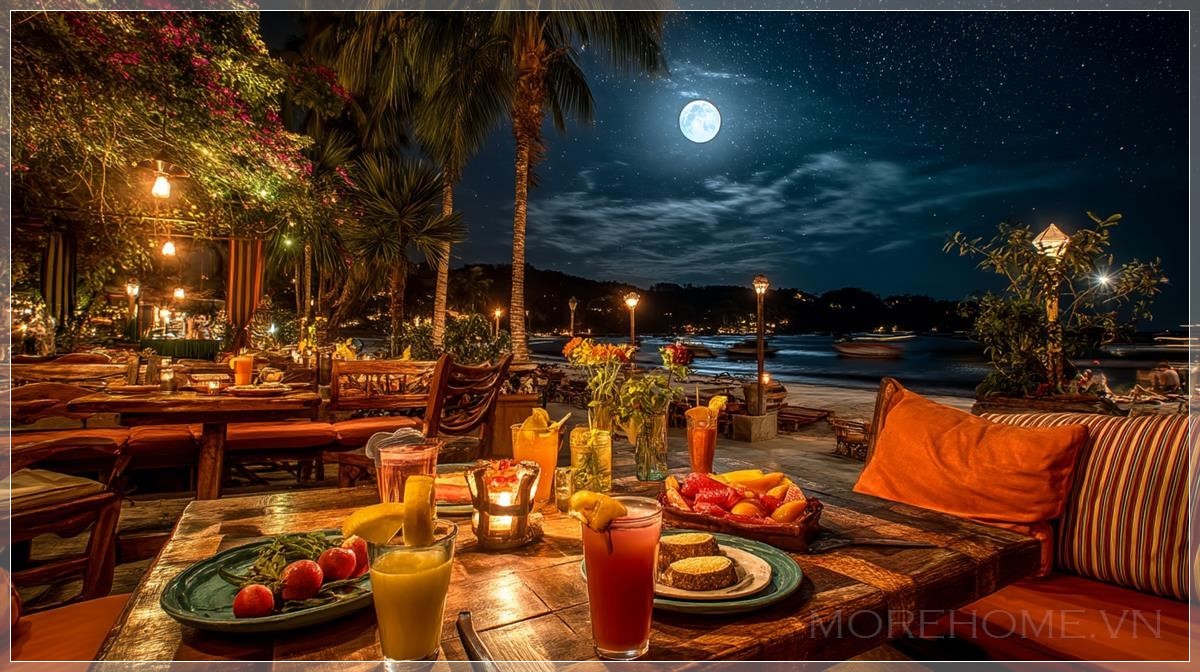 Ánh sáng dịu nhẹ từ những chiếc đèn lồng treo quanh quán tạo nên một bầu không khí ấm áp và thư giãn. Những ngọn nến nhỏ được đặt trong các lọ thủy tinh màu sắc lung linh như những viên ngọc nhỏ, tạo thêm nét lãng mạn cho không gian. Tiếng sóng biển xa xa hòa quyện với âm thanh nhẹ nhàng của nhạc guitar acoustic, tạo nên một bản giao hưởng tự nhiên êm dịu.