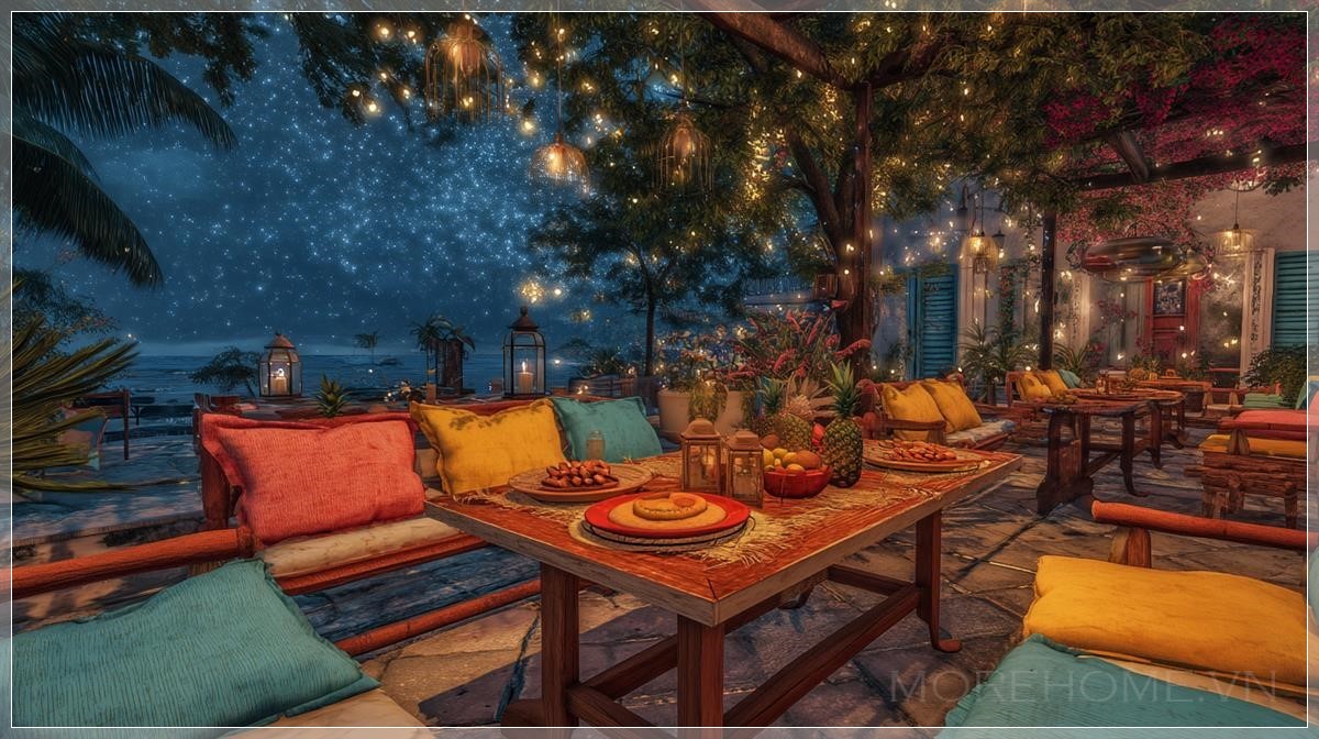 Khi màn đêm buông xuống vùng biển Manzanillo, Mexico, một thế giới kỳ diệu bắt đầu hiện ra. Tại một quán cà phê ngoài trời quyến rũ, nơi làn gió biển nhẹ nhàng vuốt ve những chiếc ghế êm ái được trang trí bằng đệm màu sắc rực rỡ, ta có thể cảm nhận được sự giao thoa tuyệt vời giữa nét duyên dáng Mexico và vẻ thanh tịnh của đêm nhiệt đới.