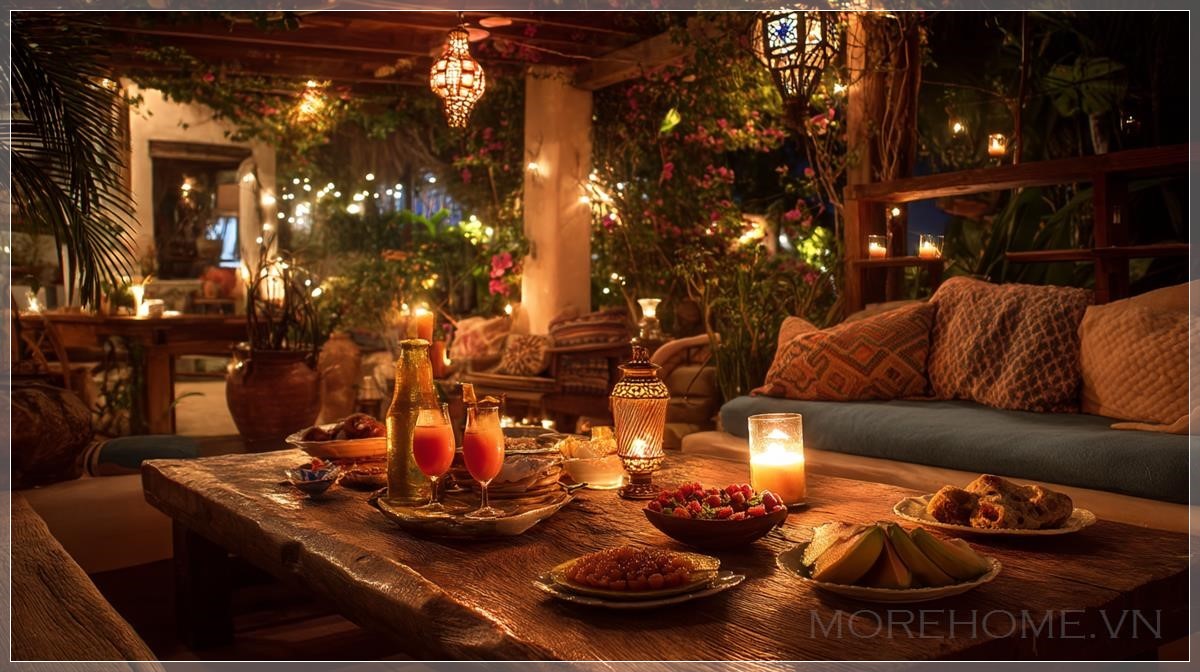 Chiếc bàn gỗ ấm cúng được trang trí như một bức tranh nghệ thuật sống động. Những ly cocktail nhiệt đới với màu sắc rực rỡ từ xanh ngọc lam của margarita đến đỏ cam quyến rũ của tequila sunrise, mỗi ly đều được trang trí bằng những lát cam, chanh và bạc hà tươi mát. Bên cạnh đó là những đĩa trái cây nhiệt đới tươi ngon: xoài vàng ươm được cắt thành từng miếng hoàn hảo, dứa thơm ngọt, đu đủ mềm mịn và những trái nho xanh mọng nước.