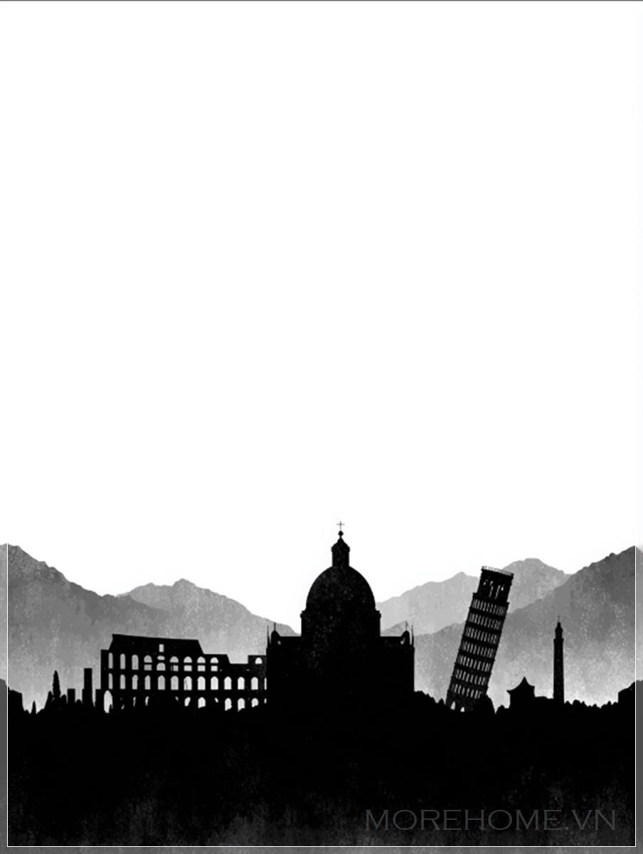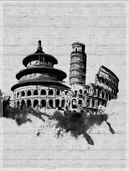 Phía bên khai, tháp nghiêng Pisa xuất hiện như một bóng ma thanh thoát, độ nghiêng đặc trưng của nó được thể hiện qua những nét cọ tinh tế. Đấu trường La Mã - Colosseum - hiện lên với những vòng cung bóng tối, mỗi tầng đấu trường như những câu chuyện lịch sử được kể lại bằng ngôn ngữ của mực và nước.
