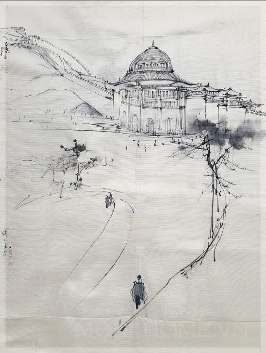Bên trái khung tranh, Đền Thiên Đàn hiện lên với những đường nét tinh tế như làn khói nhẹ bay. Mái vòm cung điện chỉ cần vài nét cọ để gợi lên cả một triết lý kiến trúc ngàn năm - sự hài hòa giữa trời đất, giữa tâm linh và thế tục. Không xa đó, Vạn Lý Trường Thành uốn lượn như con rồng đang ngủ trên sườn núi, mỗi khoanh tường thành được thể hiện qua những đường nét mềm mại nhưng đầy quyền lực.