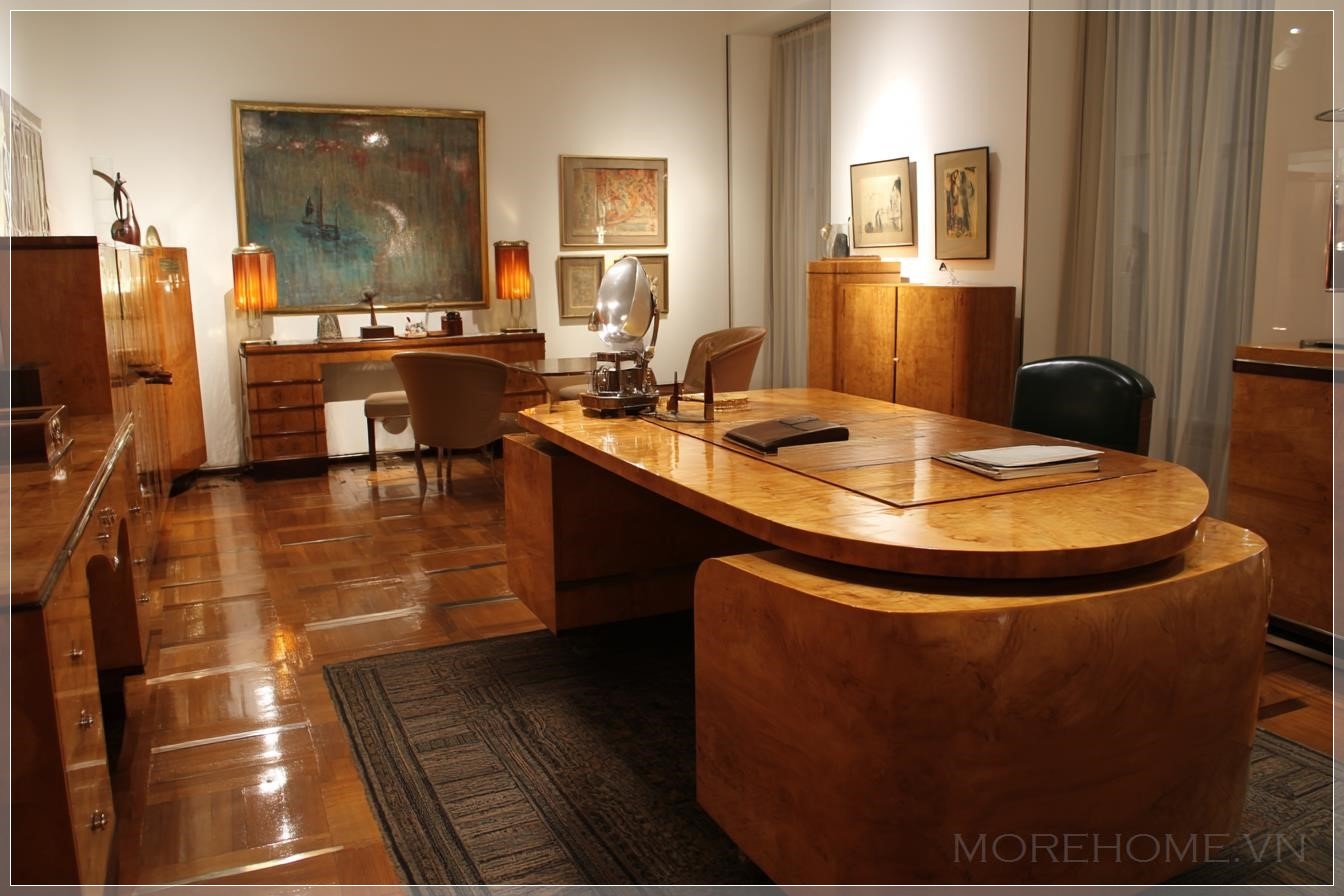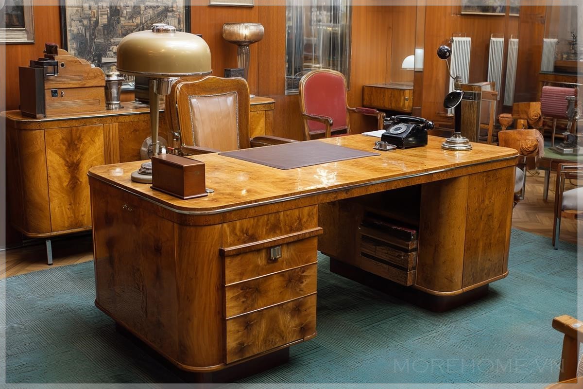 Bước vào căn phòng làm việc này, bạn như được đưa trở lại thời hoàng kim của thập niên 1930, khi mà phong cách Art Deco đang thống trị thế giới thiết kế. Ánh sáng dịu nhẹ từ cửa sổ lớn chiếu rọi lên chiếc bàn làm việc bằng gỗ óc chó bóng loáng, tạo nên những đường cong mềm mại trên bề mặt được đánh bóng tỉ mỉ.
