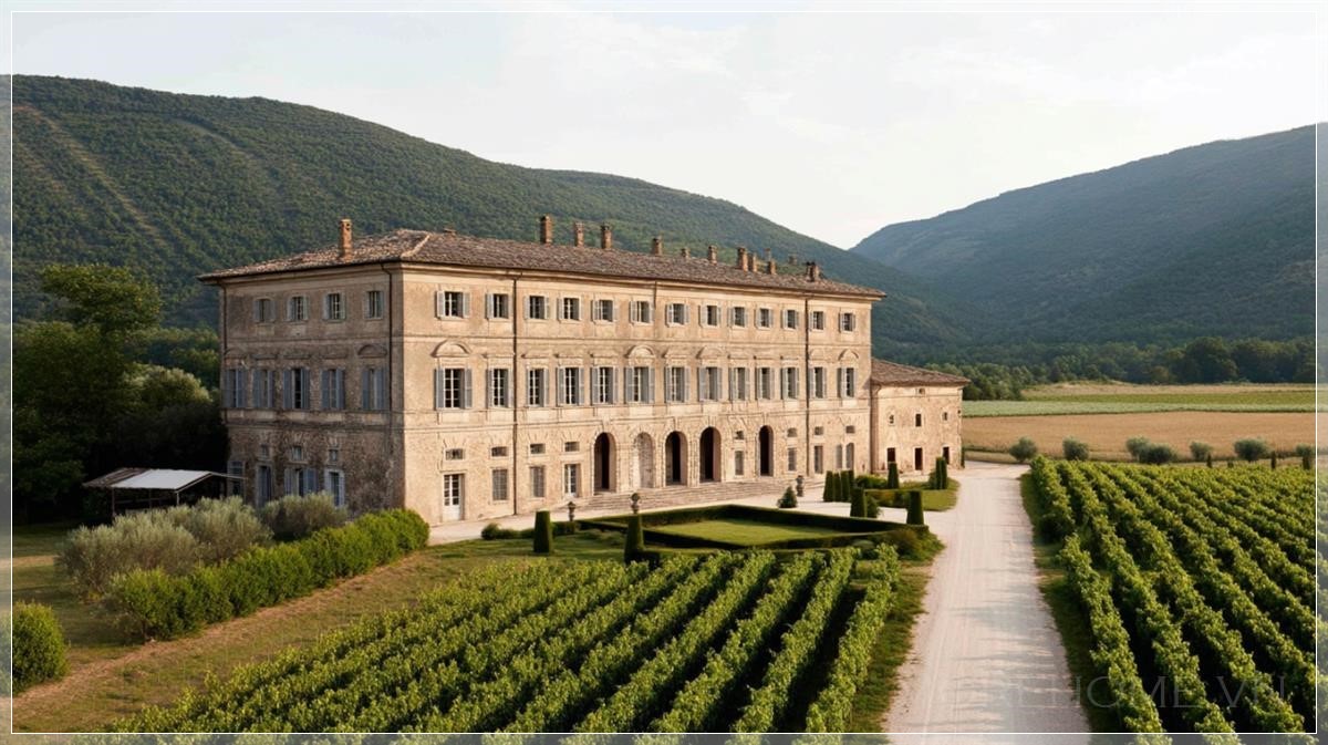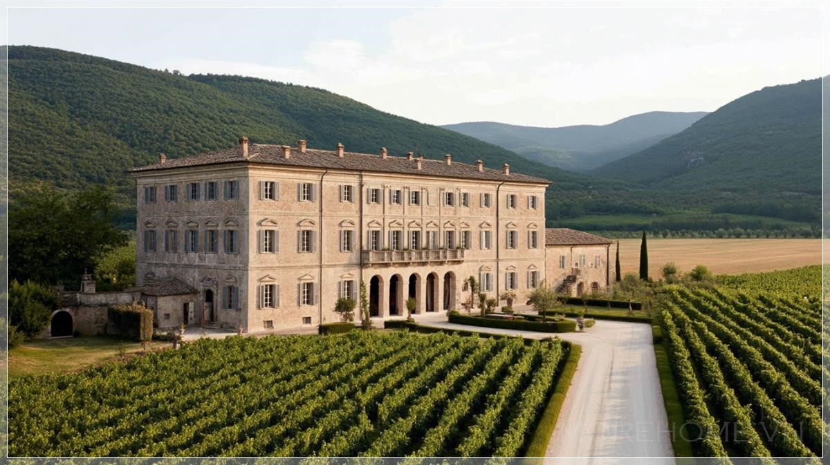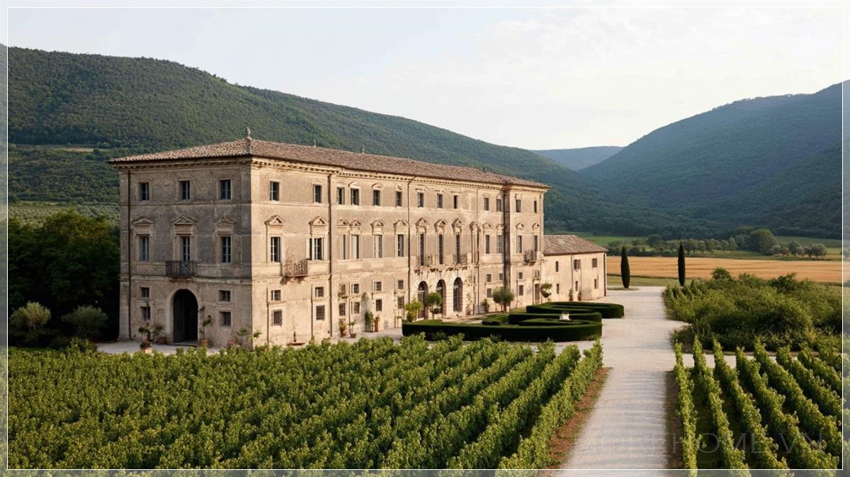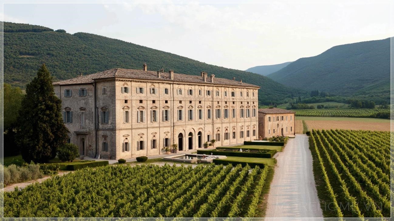 Những tia nắng vàng óng của hoàng hôn nhẹ nhàng vuốt ve mặt tiền đối xứng hoàn hảo của biệt thú đá Pháp, tạo nên một bức tranh sống động giữa lòng vùng quê Italy thơ mộng. Từ xa, ngôi villa hiện lên như một viên ngọc quý được đặt khéo léo trên nền đồi Tuscany đầy nắng gió, nơi những hàng cây cypress thẳng tắp như những người lính canh gác âm thầm bảo vệ khu vườn nho xanh mướt.