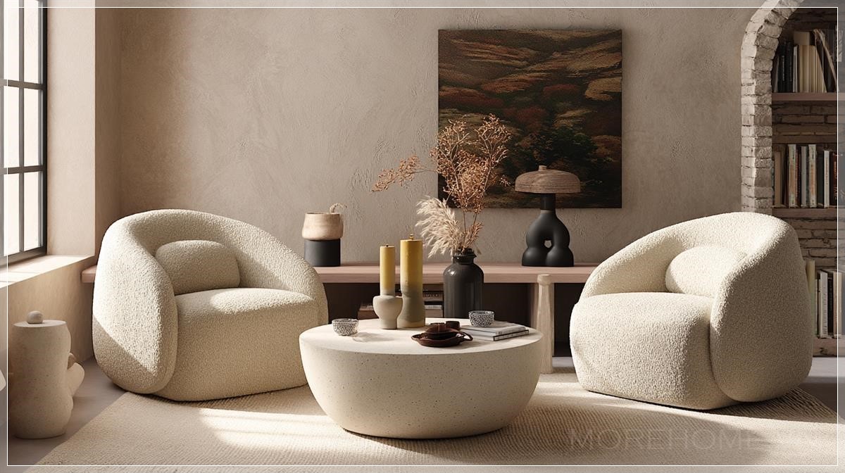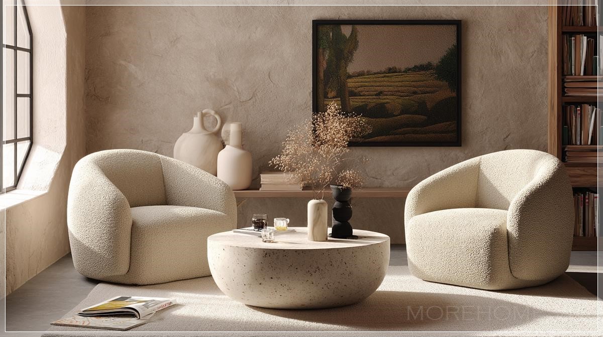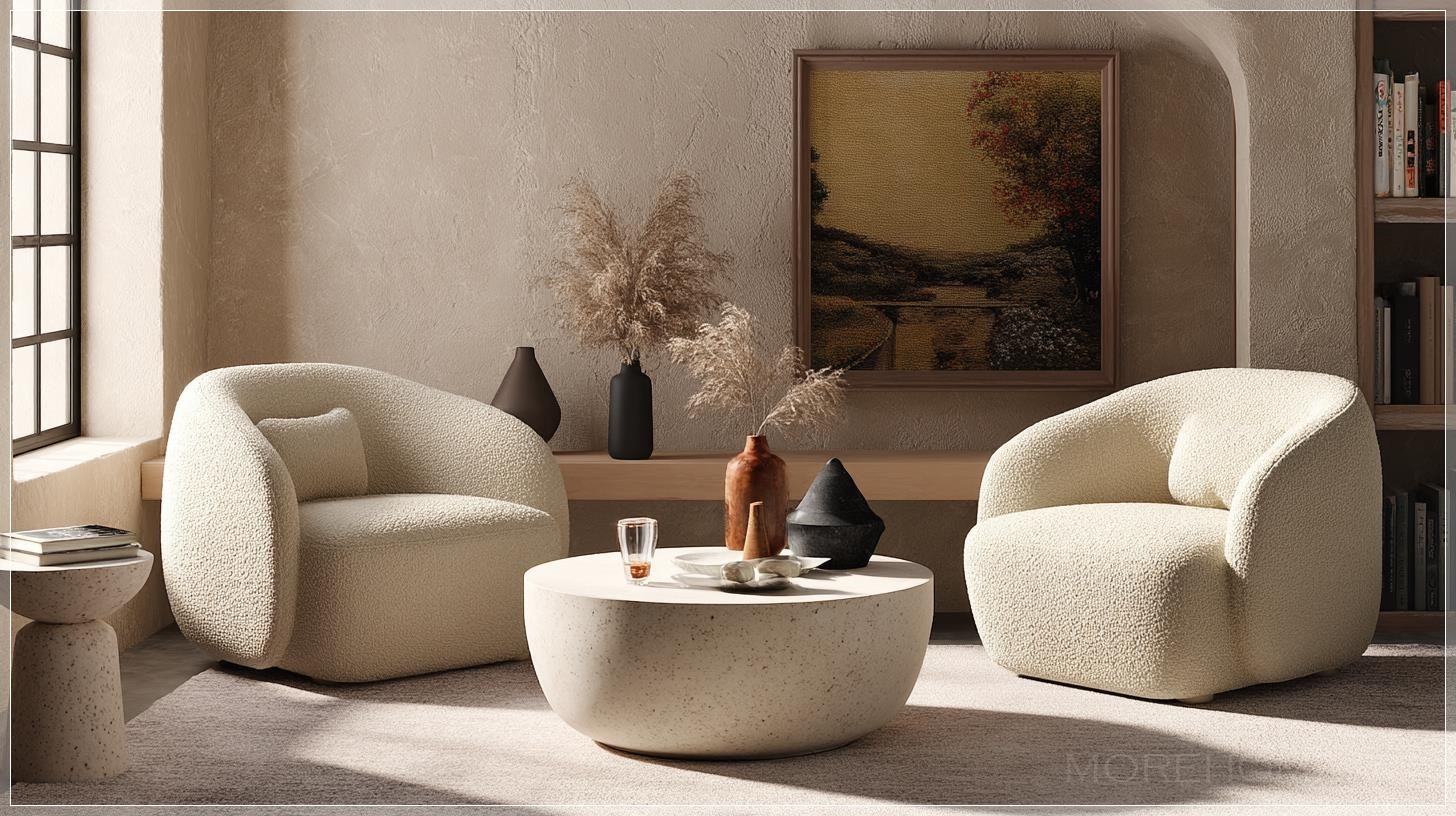 Ứng dụng thực tế của phong cách thiết kế Japandi trong phòng khách hiện đại này rất phù hợp với những gia đình yêu thích sự yên bình, giản dị nhưng cũng không thiếu phần sang trọng. Ghế bọc boucle và bàn trà tròn không chỉ là những món đồ nội thất tiện nghi mà còn là điểm nhấn làm nổi bật phong cách tối giản, mang lại sự thoải mái tối đa cho người sử dụng. Màu sắc trung tính như trắng và xám kết hợp với chất liệu gỗ tự nhiên giúp tạo ra một không gian sống ấm áp và thư giãn, thích hợp cho những buổi tối gia đình sum vầy hoặc những giờ phút thư giãn sau ngày dài làm việc căng thẳng.