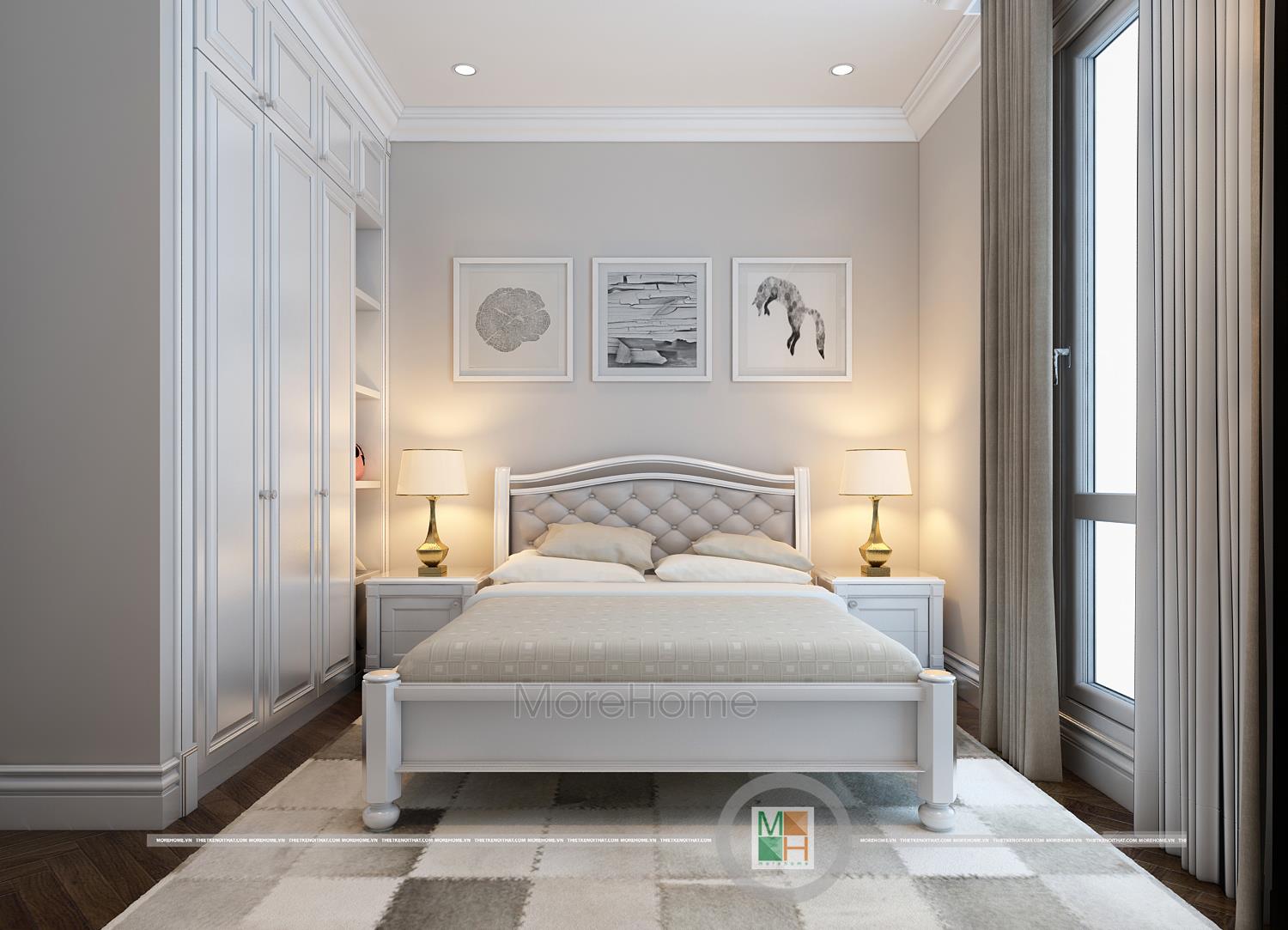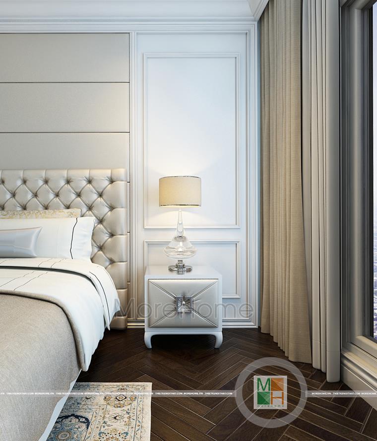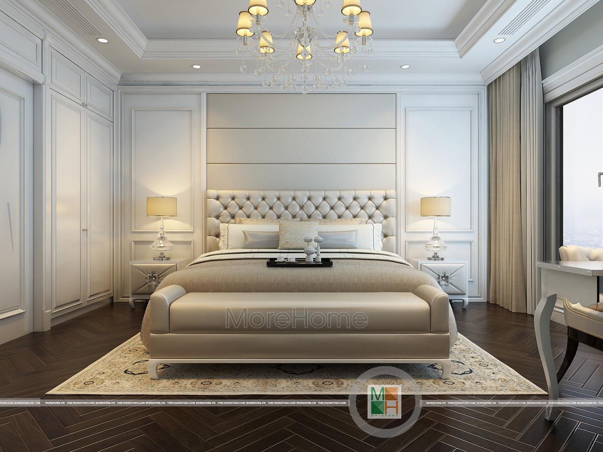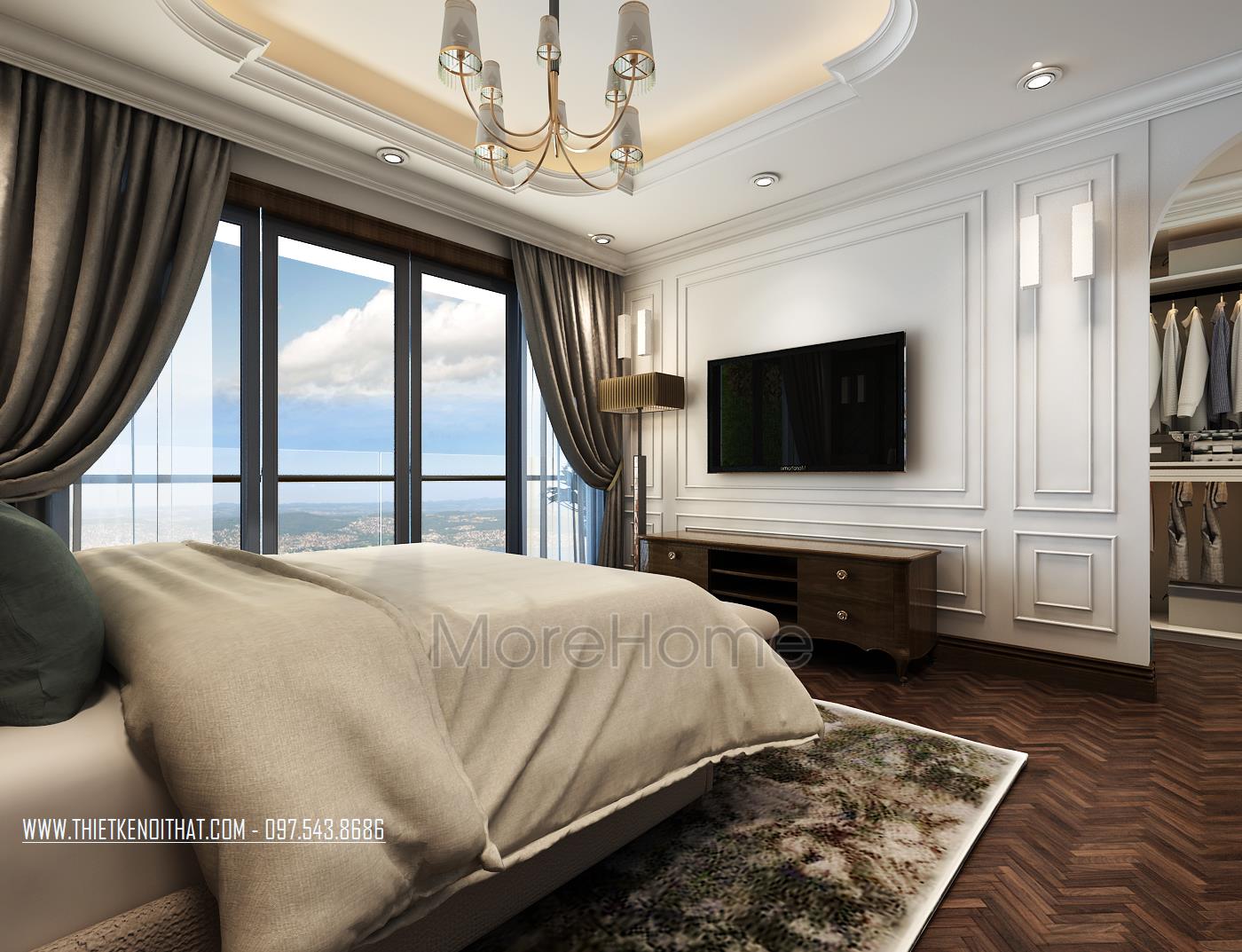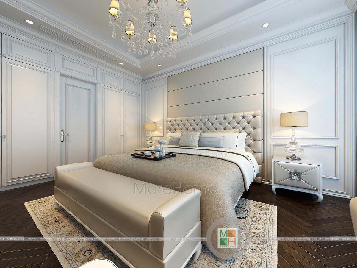 Thiết kế nội thất phòng ngủ tân cổ điển vẫn thiên về sử dụng các tone màu nhẹ nhàng, nâu sữa, ghi sáng, trắng vừa tạo cảm giác đồng nhất trong không gian lại góp phần lớn tạo cảm giác cơi nới cho căn phòng. Kính cường lực trong suốt được sử dụng để tạo không gian mở, mang ánh sáng tự nhiên vào phòng giúp mang lại hứng khởi cho gia chủ. Thiết kế kệ tủ đơn giản, gần như tạo mặt phẳng tường vừa đảm bảo tính tiện nghi lại không tốn quá nhiều diện tích.