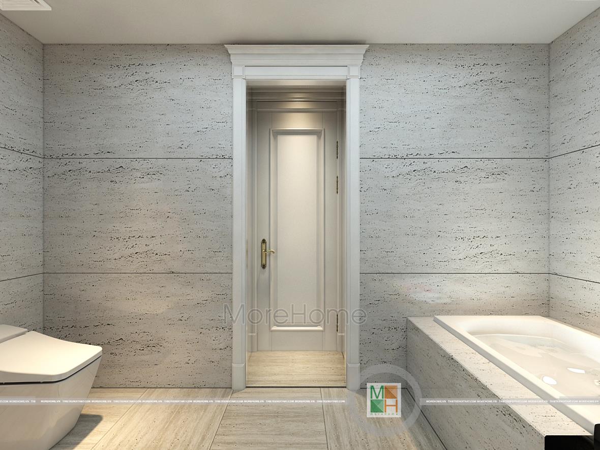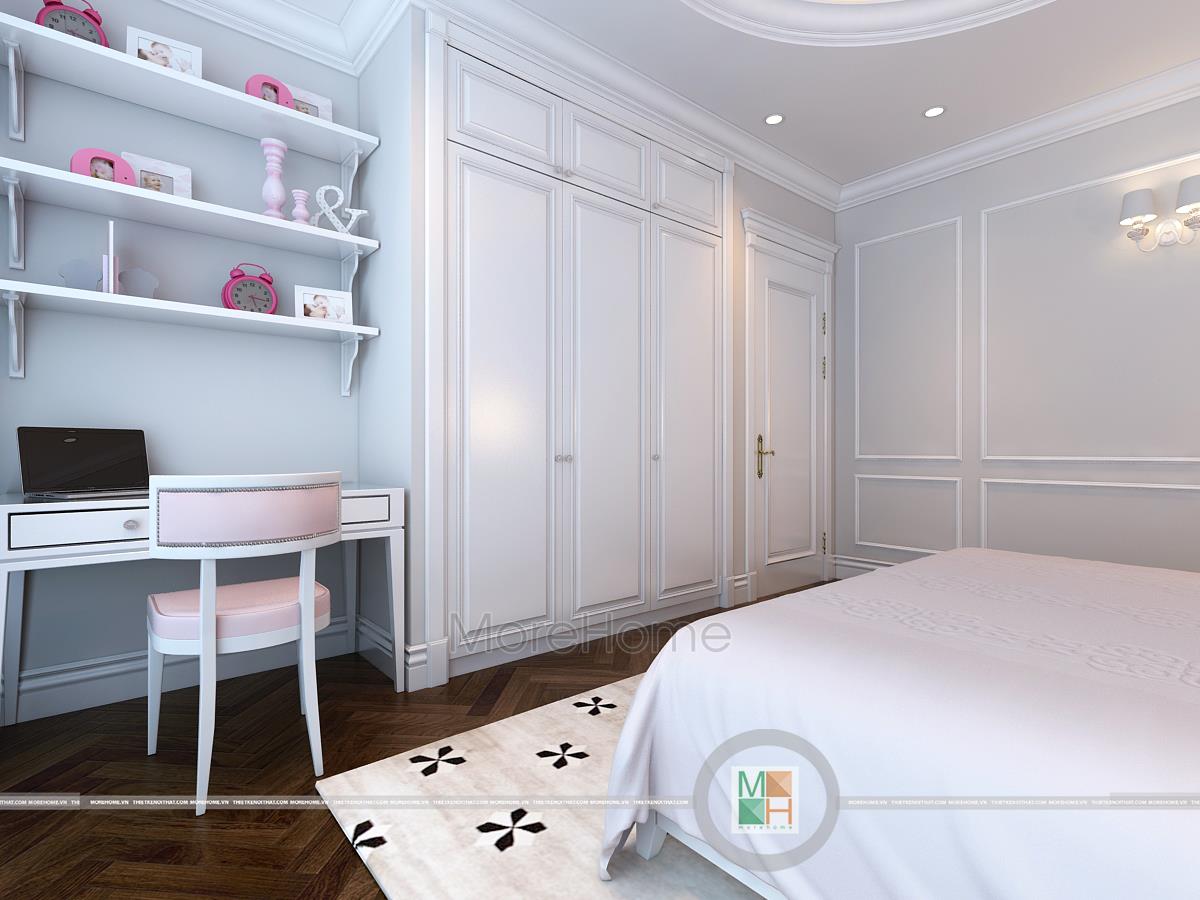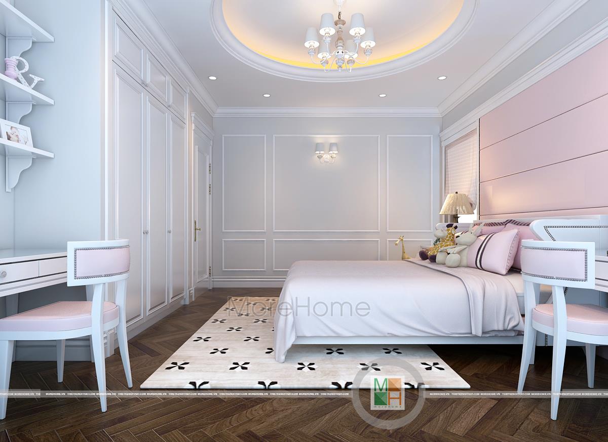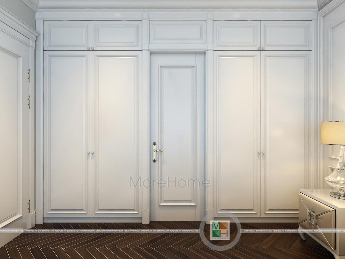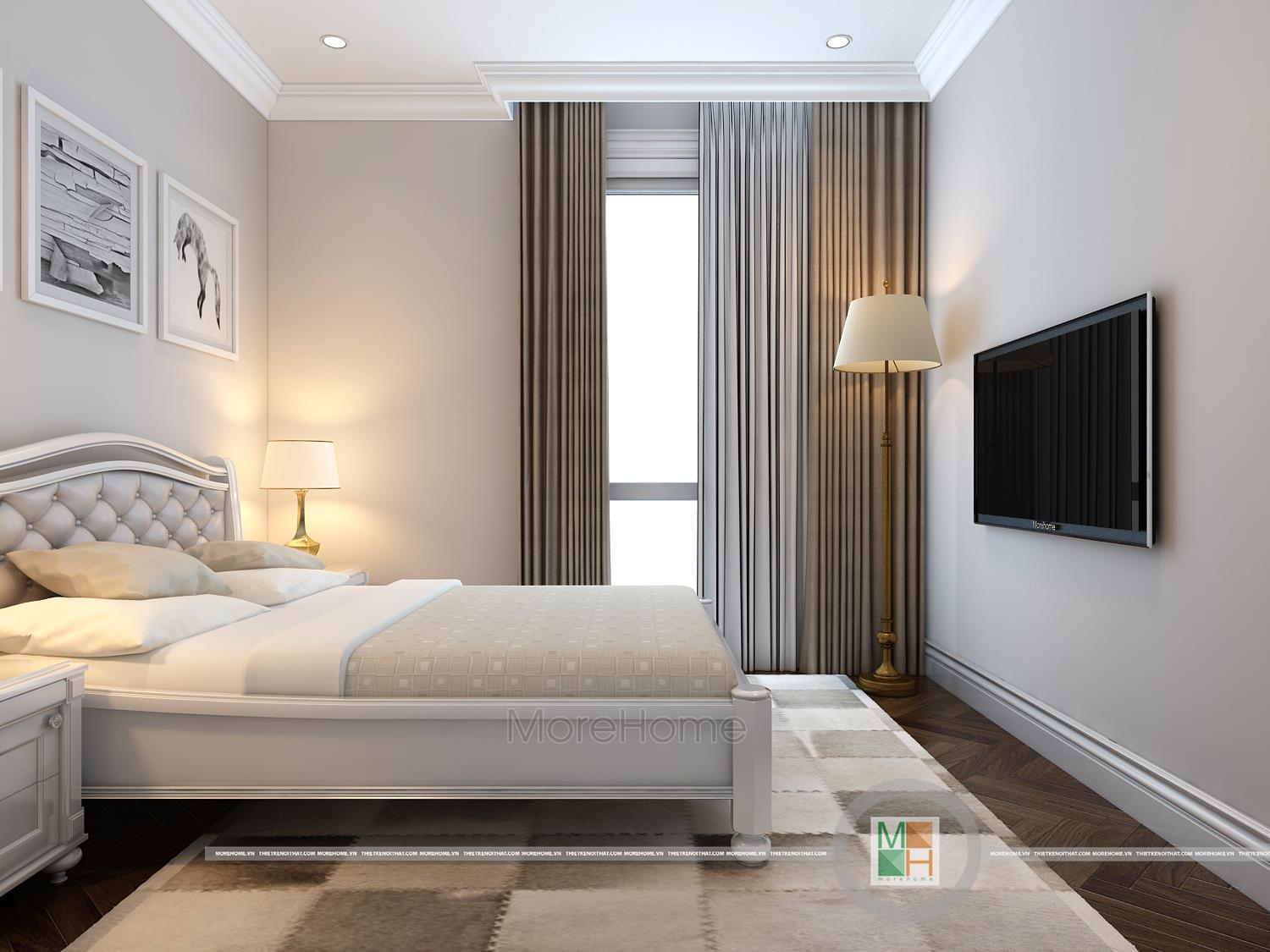 Thiết kế nội thất phòng ngủ tân cổ điển vẫn thiên về sử dụng các tone màu nhẹ nhàng, nâu sữa, ghi sáng, trắng vừa tạo cảm giác đồng nhất trong không gian lại góp phần lớn tạo cảm giác cơi nới cho căn phòng. Kính cường lực trong suốt được sử dụng để tạo không gian mở, mang ánh sáng tự nhiên vào phòng giúp mang lại hứng khởi cho gia chủ. Thiết kế kệ tủ đơn giản, gần như tạo mặt phẳng tường vừa đảm bảo tính tiện nghi lại không tốn quá nhiều diện tích.
