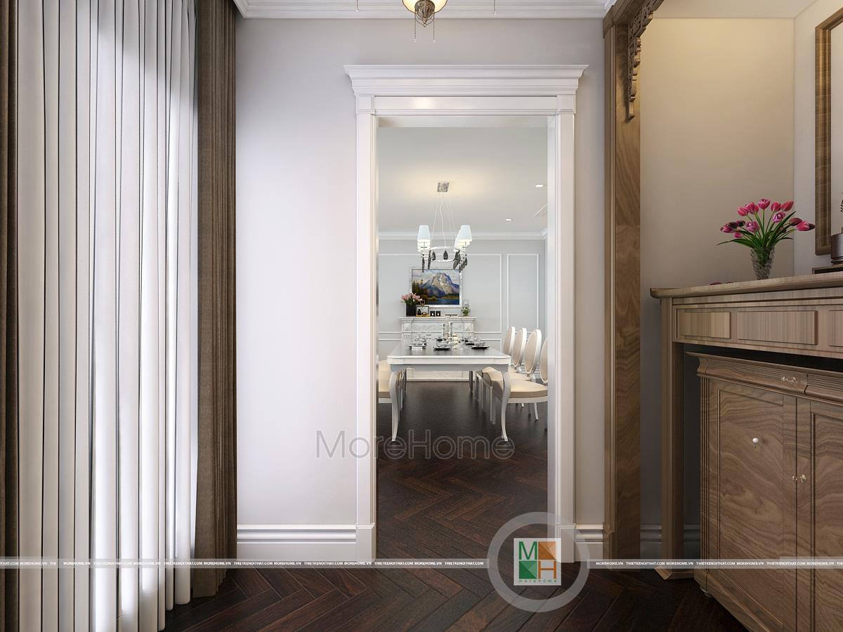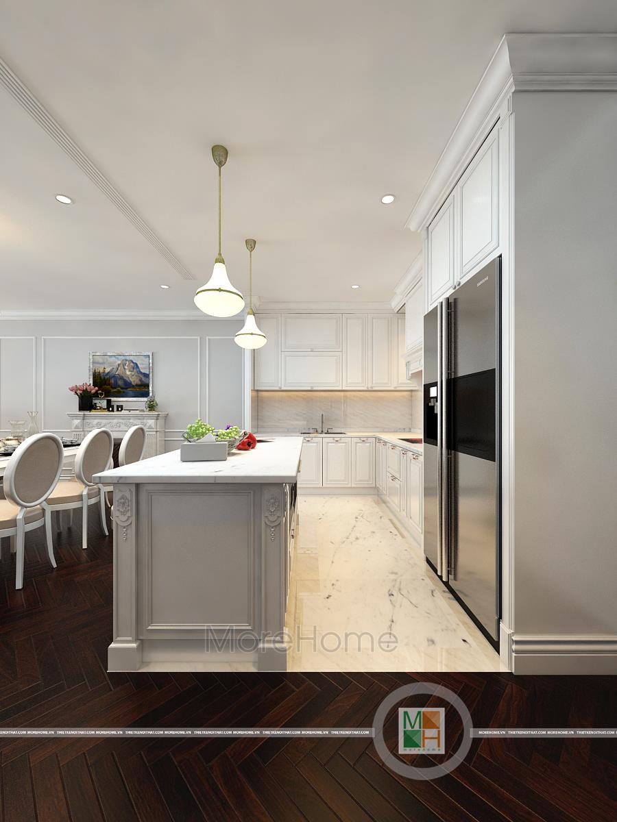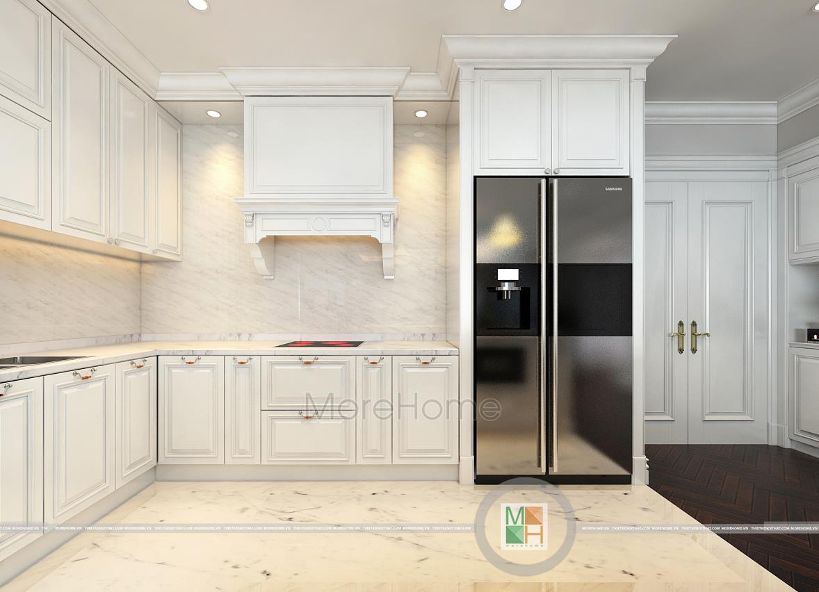 Tiếp theo là thiết kế nội thất bếp tân cổ điển. Tone màu mà kiến trúc sư ưu ái lựa chọn là màu trắng tinh khôi. Thiết kế quây gọn gàng thành một không gian riêng biệt đảm bảo tính rõ ràng trong thiết kế. Tủ bếp không quá cầu kỳ, được thiết kế đơn sắc với các nét trạm khắc tinh tế vừa đảm bảo không gian mở công năng lại vừa tạo sự nhất quán trong thiết kế tân cổ điển. Thay vì bức tường thô cứng chặn đứng không gian, kiến trúc sư đã khéo léo thay thế bằng thiết kế bệ bếp gọn gàng, chiều cao vừa phải giúp không gian mở, tăng khả năng quan sát cho gia chủ, tăng tính tiện nghi cho căn bếp.