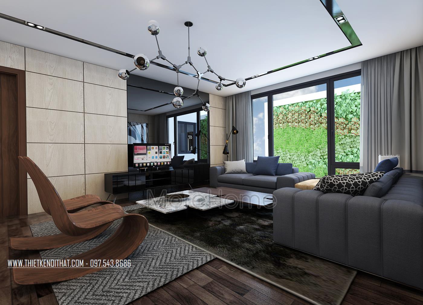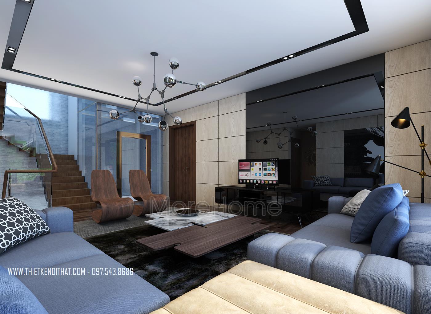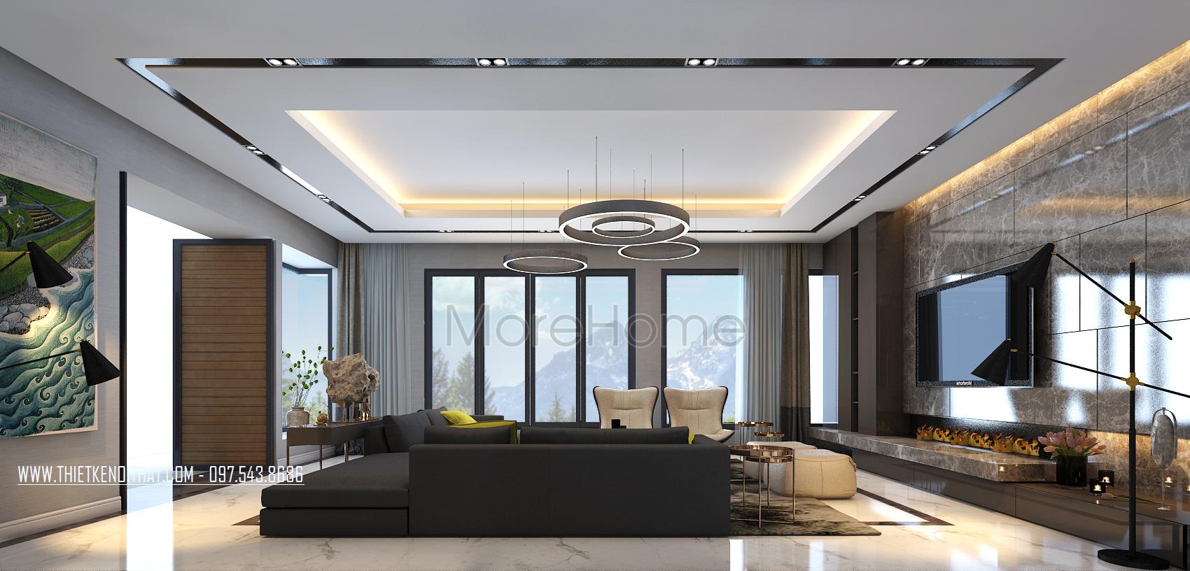 Thiết kế nội thất phòng khách biệt thự hiện đại sử dụng tone màu tối làm chủ đạo. Thiết kế ghế sofa đơn giản, không cầu kỳ về chi tiết, mang đến sự cân bằng và thoải mái về đường nét cho thiết kế. Ghế sofa được lựa chọn khá linh hoạt, có độ mở lớn, dạng to bành vững chãi gợi cảm giác an toàn và vững chãi. Không gian phòng khách bị bao bọc bởi bốn bức tường thô cứng đã được thay đổi hoàn toàn, thay vào đó là thiết kế mở với kính cường lực trong suốt và thiết kế mảng tường vân đá tự nhiên.