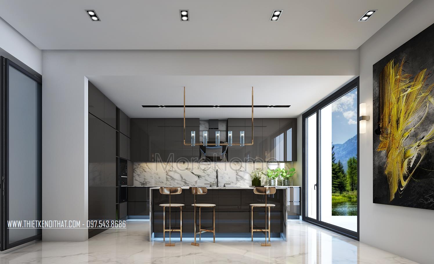 Thiết kế khu bếp hiện đại liền kề không hề tạo vách ngăn giúp gia chủ thuận tiện hơn trong việc di chuyển và tạo độ mở cho không gian. Kệ tủ bếp được thiết kế không quá phức tạp hay cầu kỳ với các chi tiết cầu kỳ, thay vào đó, đây là các chi tiết tối giản, nhấn mạnh vào tính công năng. Các bức tranh lớn hay thiết kế lấy ánh sáng làm tâm điểm chính là sức hút chính của thiết kế này, vừa thể hiện sự hiện đại lại không làm mất đi tính thẩm mỹ và công năng sử dụng.