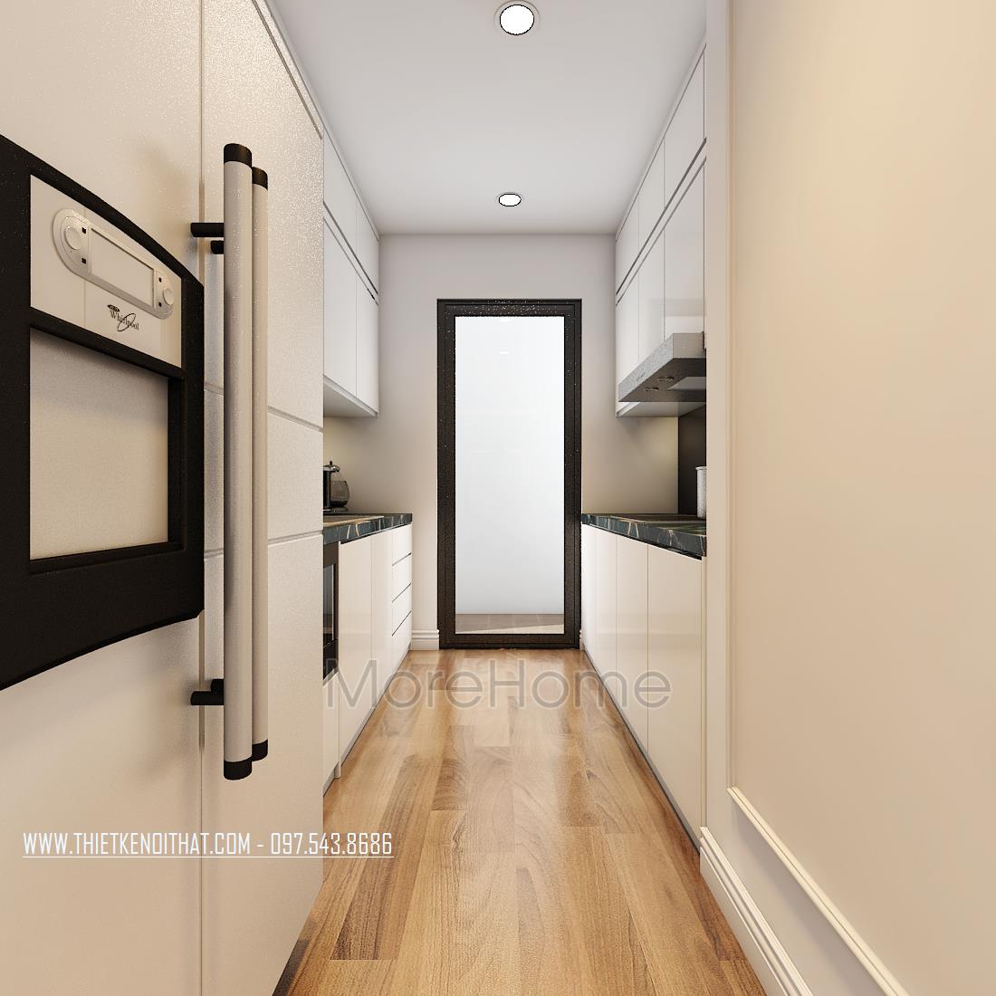Thiết kế nội thất căn bếp nhỏ được bố trí thông với lối ra phía sau căn hộ. Thiết kế cửa kính trong suốt mang ánh sáng tràn vào không gian bếp, góp phần khắc phục nhược điểm về diện tích của căn phòng. Hệ thống tủ bếp đối xứng, đa ngăn đảm bảo tính tiện nghi cho gia chủ. Thiết kế kệ đá hoa văn đơn giản, tone màu đen trung tính hiện đại và tinh tế. Với thiết kế kệ đá, kiến trúc sư cũng giúp cho gia chủ dễ dàng hơn trong việc dọn dẹp và lau dọn căn bếp.
