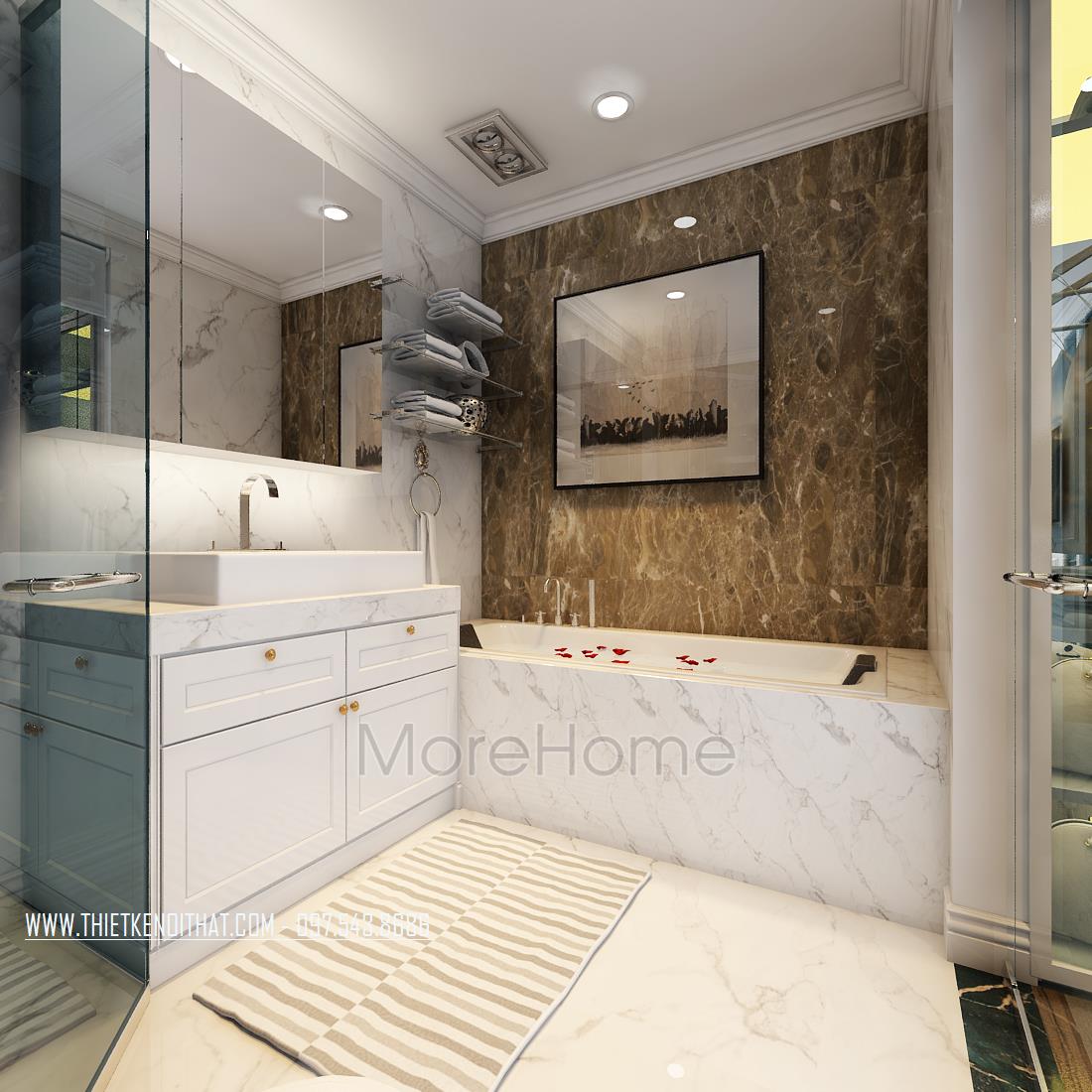 Cuối cùng là thiết kế nội thất phòng tắm hiện đại. Các vật liệu nhẹ như gương, kính cường lực trong suốt là các vật liệu được sử dụng nhiều nhất giúp tạo sự liền mạch và tăng độ mở cho không gian. Đá tự nhiên ốp tường hoa văn đơn giản, vừa đảm bảo tính thẩm mỹ lại dễ dàng lau chùi.