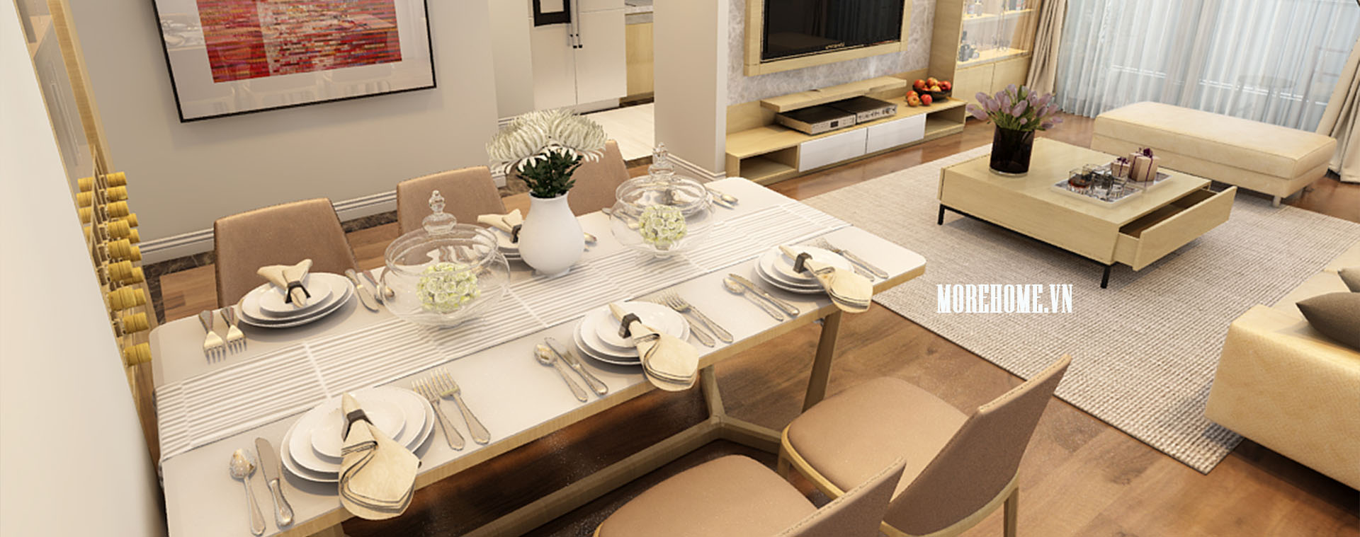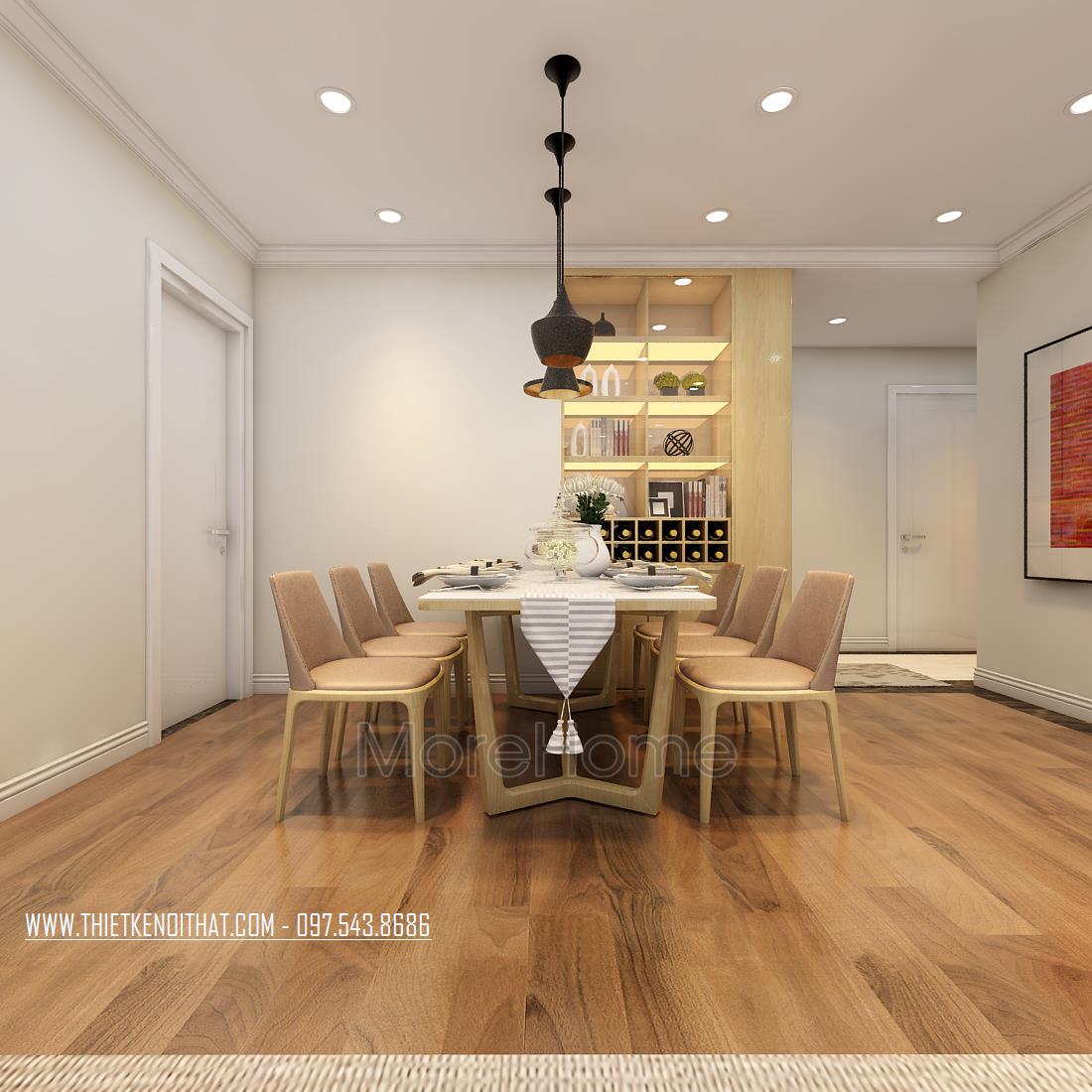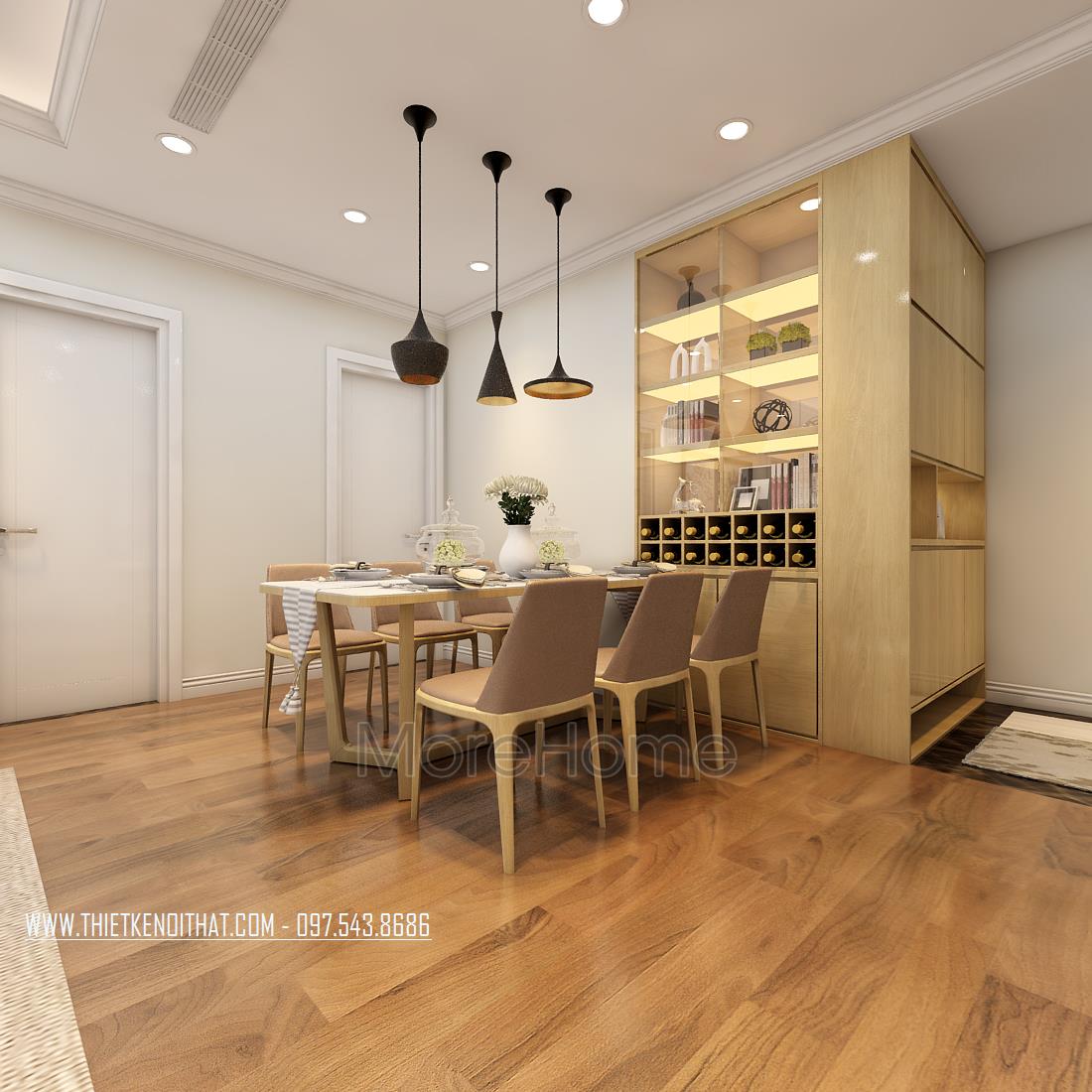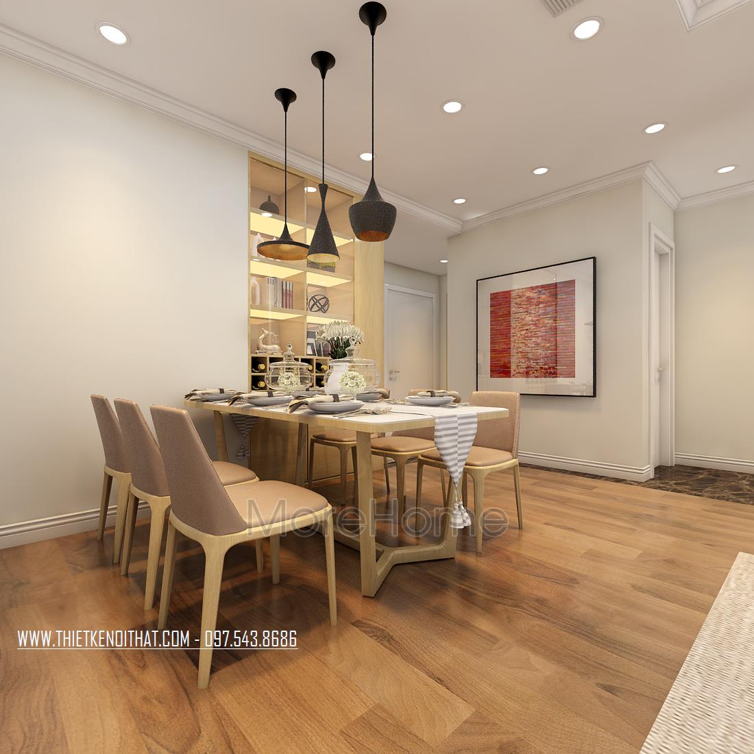 Tiếp theo là thiết kế nội thất không gian bàn ăn hiện đại. Không gian thiết kế được sắp xếp khá giản đơn với bộ bàn ghế nhỏ, không hề nhấn mạnh vào các chi tiết trang trí những thiết kế khá ấn tượng nhờ vào tính công năng. Thiết kế tủ gỗ kính trong suốt đa ngăn vừa đảm bảo tính công năng lại giúp không gian trở nên ấn tượng hơn, tạo điểm nhấn trong thiết kế. Ngoài ra, các chi tiết trang trí nhẹ nhàng như đèn chiếu sáng, tranh treo tường sáng tạo giúp không gian trở nên ấn tượng và thu hút hơn rất nhiều. Bàn ăn được đặt gọn gàng, thiết kế linh hoạt, dễ dàng biến thu gọn, mở ra không gian đa năng giúp tăng mục đích sử dụng cho không gian chung cư hẹp.