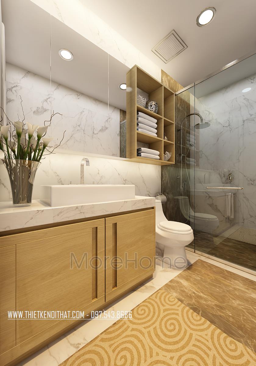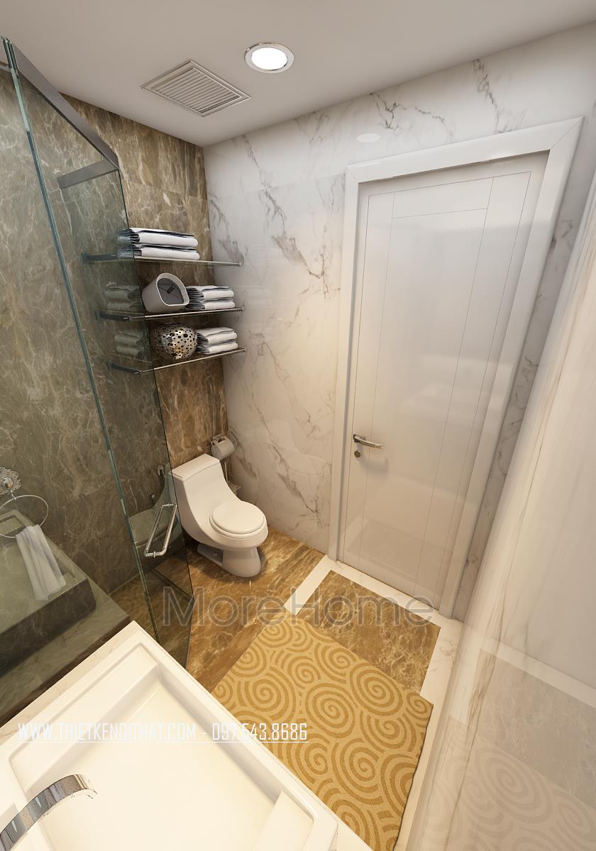 Cuối cùng là không gian thiết kế nội thất phòng tắm hiện đại. Thiết kế khá thu hút bởi kiến trúc sư đã sử dụng các vật liệu mát như đá tự nhiên và kính cường lực. Các vật liệu này là mấu chốt giúp mang lại một không gian thoáng và thư giãn cho căn phòng hẹp này. Độ phản chiếu nhẹ nhàng từ kính và gương giúp mang lại cảm giác cơi nới cho căn phòng, xóa tan sự bí bách, khó chịu.