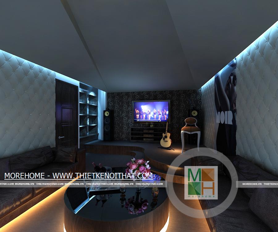 Vị trí của phòng karaoke được lựa chọn dưới tầng hầm, phù hợp để không ảnh hưởng tới các không gian sinh hoạt khác của gia đình. Ngoài ra, căn phòng cũng được xử lí cách âm tốt bằng các vật liệu như xốp, mút, bông thủy tinh… Hệ thống chiếu sáng được thiết kế hợp lí để phù hợp với từng lúc, từng đối tượng sử dụng.
