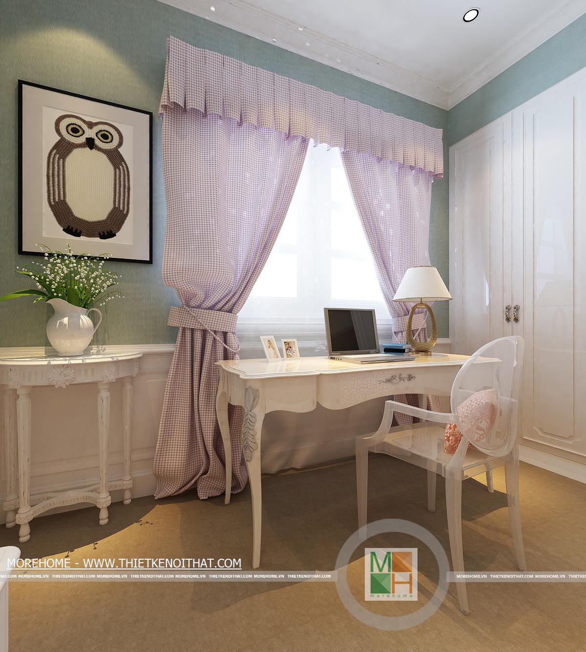 Phòng ngủ con gái thì sử dụng tông màu hồng nhạt với vách ngăn được kết hợp làm design và giá để đồ chơi. Góc học tập được kê sát cửa sổ với phần rèm cửa màu hồng cùng tông với màu căn phòng.