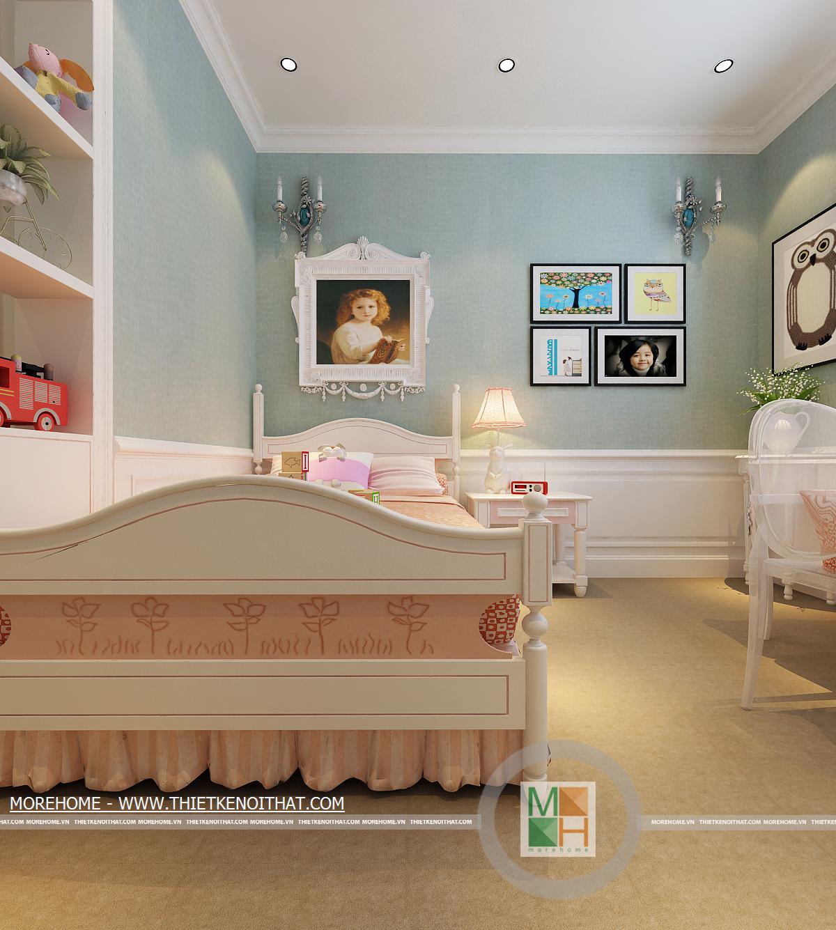 Phòng ngủ con trai trẻ trung hơn với tông màu xanh nước biển và những bức tranh tường năng động. Thảm trải sàn và giường mang phong cách tân cổ điển theo mô tuýp chung của tổng thể nhưng vẫn mang hơi hướng cá tính, sôi động phù hợp với lứa tuổi của con.
