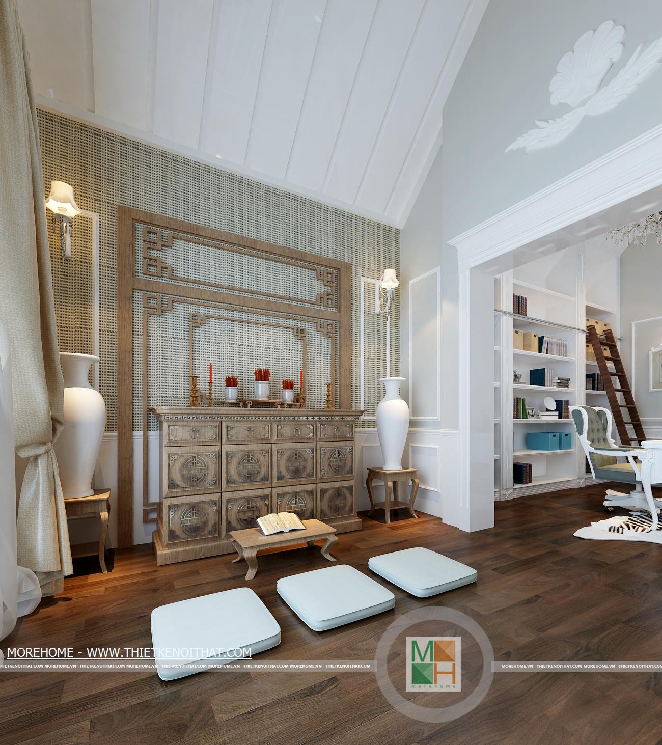 Phòng thờ thể hiện được không khí linh thiêng của đời sống tâm linh, nên thiết kế các chi tiết và sắp đặt trang trọng nhưng không cầu kỳ.