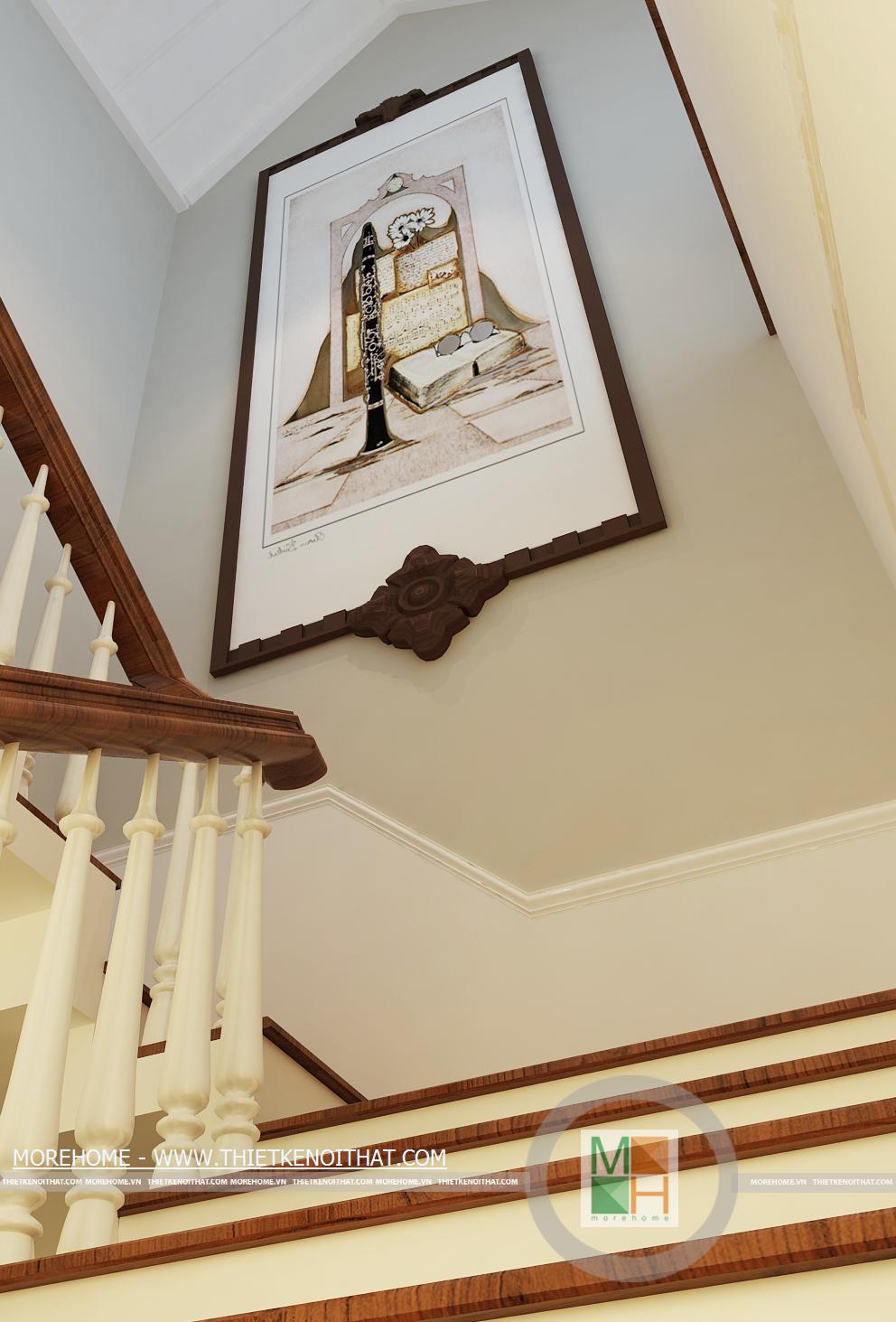 Toàn bộ trần áp mái của tầng 3 được ốp gỗ sơn trắng, cho không gian sáng sủa rộng rãi hơn nữa. Hành lang được đặt bức tranh lớn, trìu tượng để làm cân đối không gian. Có thể nói, đây là không gian mơ ước của rất nhiều người.