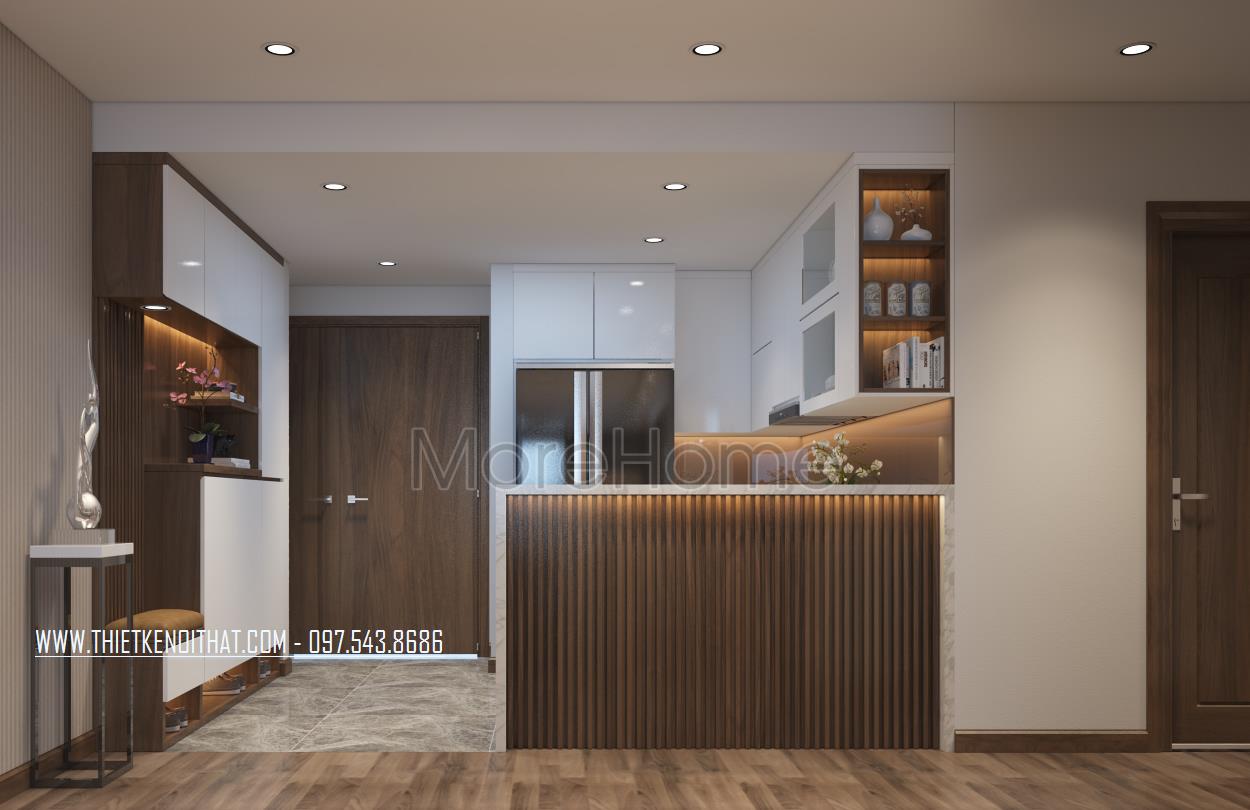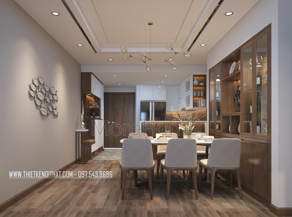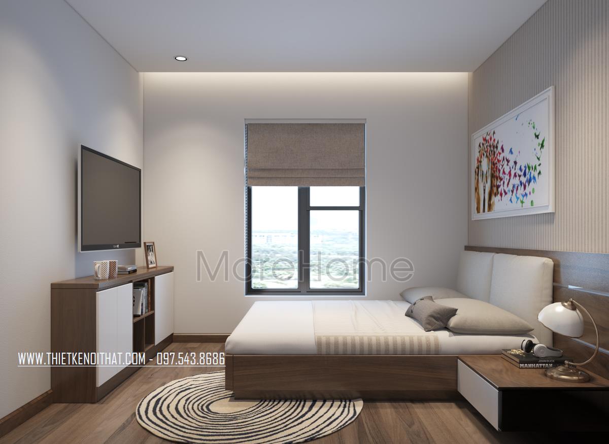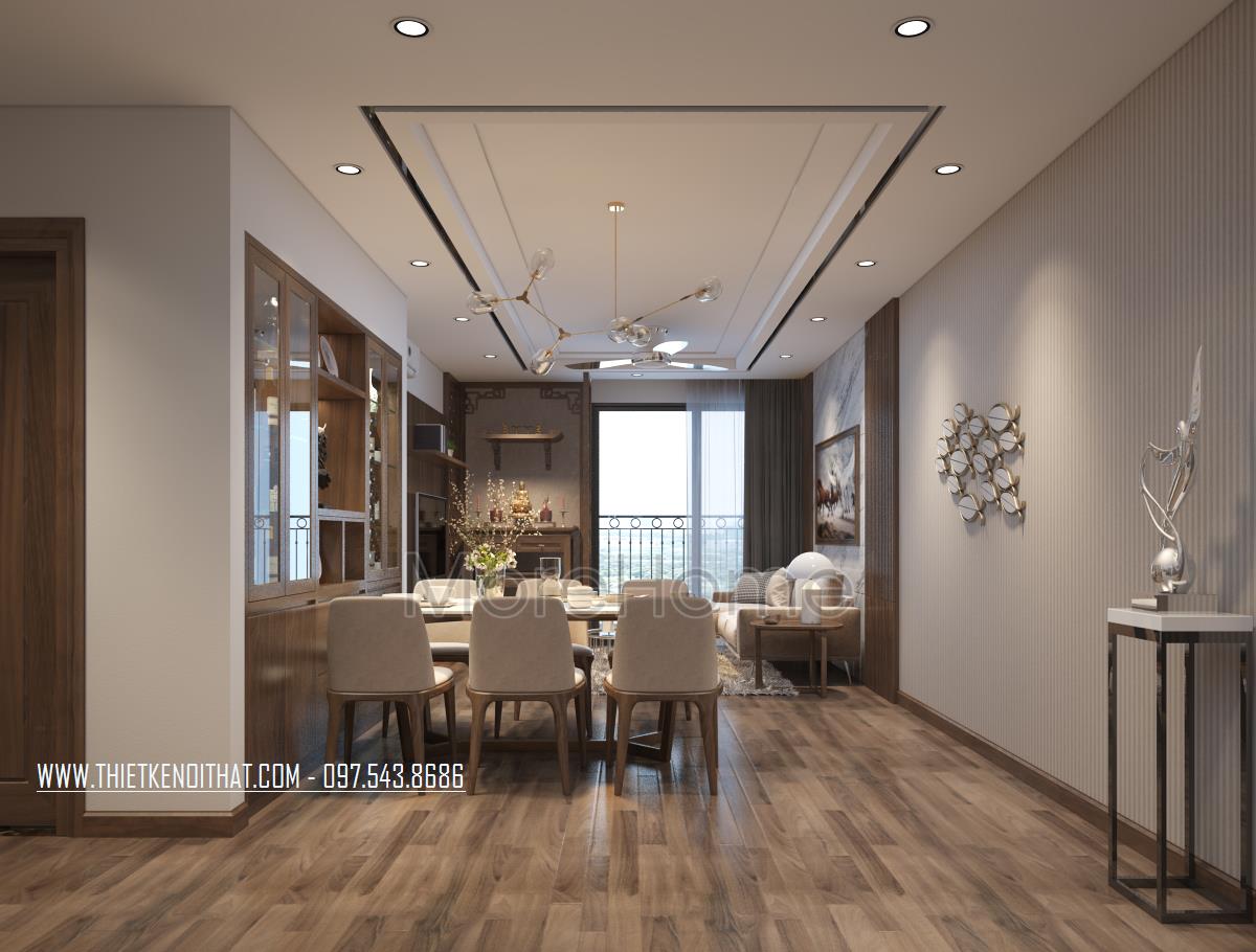 Thiết kế nội thất gỗ chung cư Mandarin Garden 2 mang phong cách hiện đại là thiết kế sử dụng hầu hết các thanh ngang đơn giản, không cầu kỳ trong chi tiết hay trạm khắc. Nhờ đặc điểm như vậy mà thiết kế trở nên rất gọn gàng, tiết kiệm khá nhiều diện tích sử dụng, bên cạnh đó, màu sắc trẻ trung, tinh tế cũng việc sử dụng các vật liệu nhẹ như kính cường lực, gỗ tự nhiên, giấy dán tường,… giúp tạo sự tươi mới cho không gian.