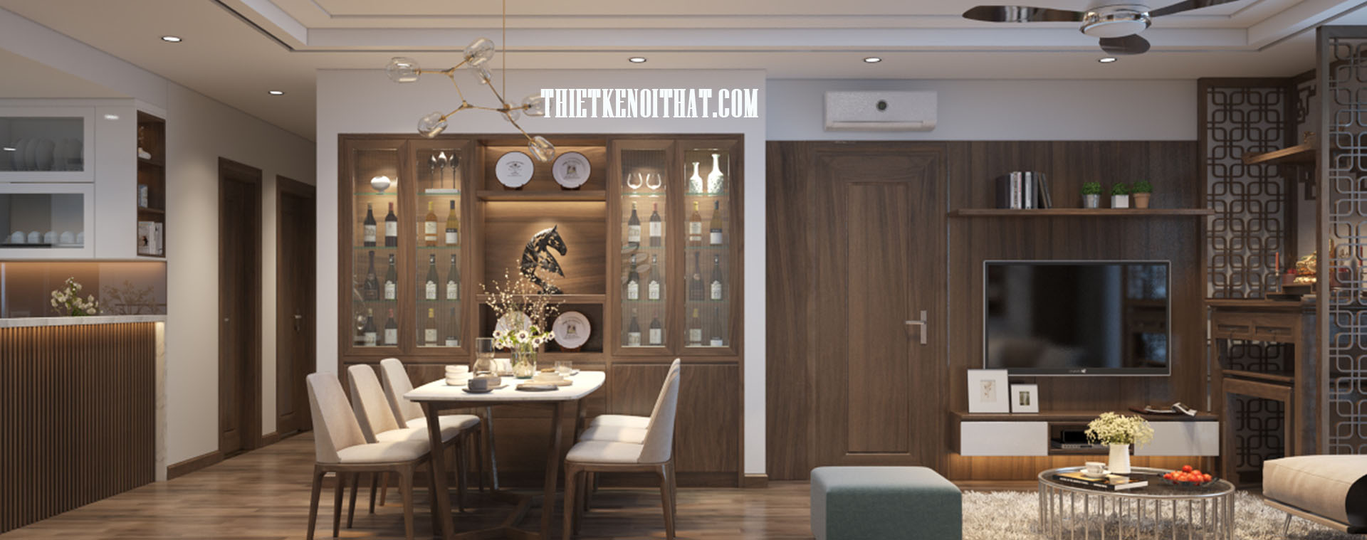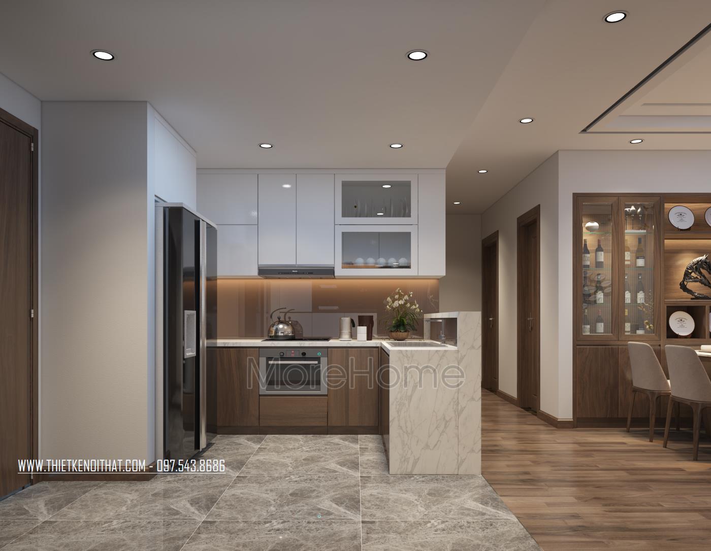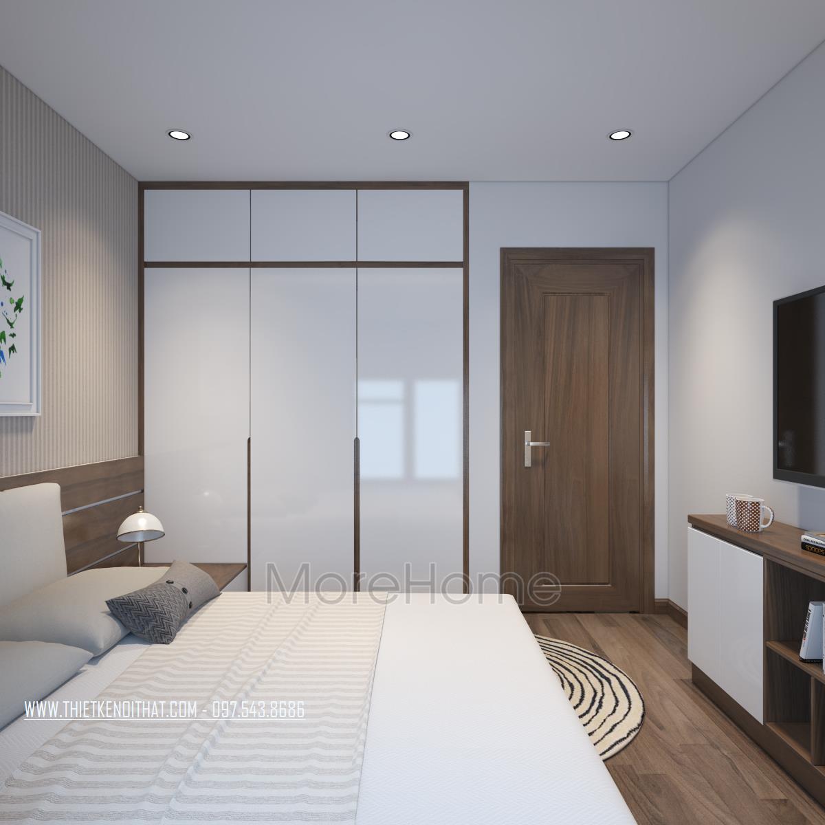 Thiết kế nội thất gỗ chung cư Mandarin Garden 2 mang phong cách hiện đại là thiết kế sử dụng hầu hết các thanh ngang đơn giản, không cầu kỳ trong chi tiết hay trạm khắc. Nhờ đặc điểm như vậy mà thiết kế trở nên rất gọn gàng, tiết kiệm khá nhiều diện tích sử dụng, bên cạnh đó, màu sắc trẻ trung, tinh tế cũng việc sử dụng các vật liệu nhẹ như kính cường lực, gỗ tự nhiên, giấy dán tường,… giúp tạo sự tươi mới cho không gian.