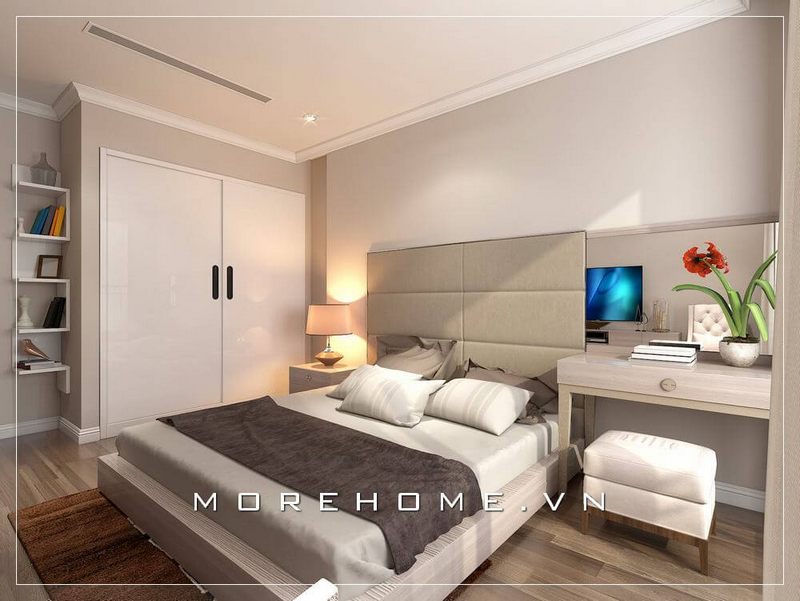 Mẫu tủ áo gỗ công nghiệp màu trắng sang trọng, thiết kế kịch trần kết hợp bàn trang điểm tạo sự thoải mái và tiện nghi nhất cho chủ nhân căn phòng