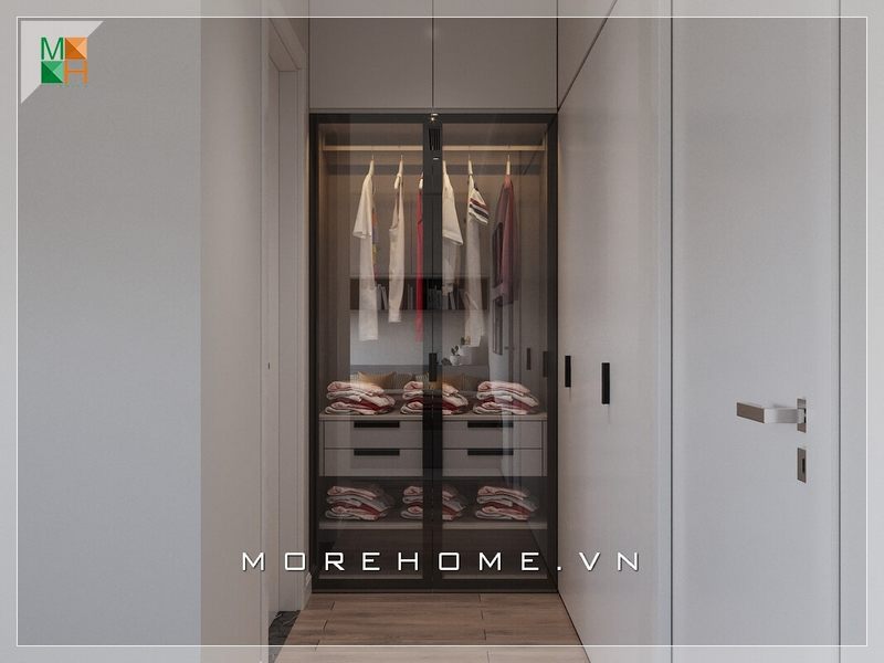 Tủ áo gỗ công nghiệp hiện đại với phần kệ bên hông cùng với ngăn nắp và khóa học hơn sẽ giúp gia chủ sắp xếp đồ đạc của mình một cách hiệu quả hơn.