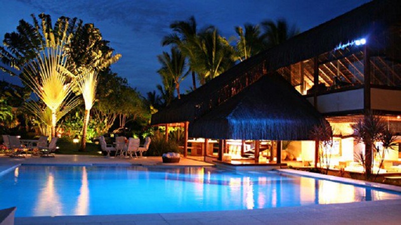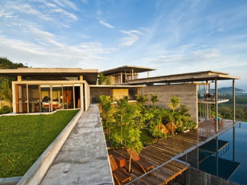 Lại là một thiết kế biệt thự mái lá nhưng sự độc đáo lại không hề giống nhau. Phần mái được chia làm 2 tầng theo 2 hình khối khác nhau của căn nhà. Xung quanh là những loài cây thân cọ, mang đến không gian rất thiên nhiên, rất mộc mạc. Có thể thấy, biệt thự được thiết kế sát hồ bơi, không hề có bất cứ một khoảng cách nào. Điều này sẽ thực sự khiến cho bạn cảm thấy được thư giãn, được ngâm mình trong nước bất cứ khi nào bạn muốn.