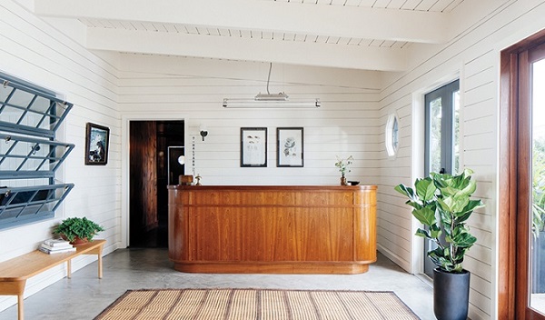 Trần nhà thấp, được làm bằng những thanh gỗ trắng, hơi dốc xuống một chút. Thiết kế nhà có một chiếc quầy bằng gỗ màu nâu vàng bắt mắt, có một chiếc bàn nhỏ và dài đặt một vài cuốn sách. Đặc biệt là một ô cửa sổ cách điệu từ thiết kế cửa gió, khiến không gian không bị nhàm chán.