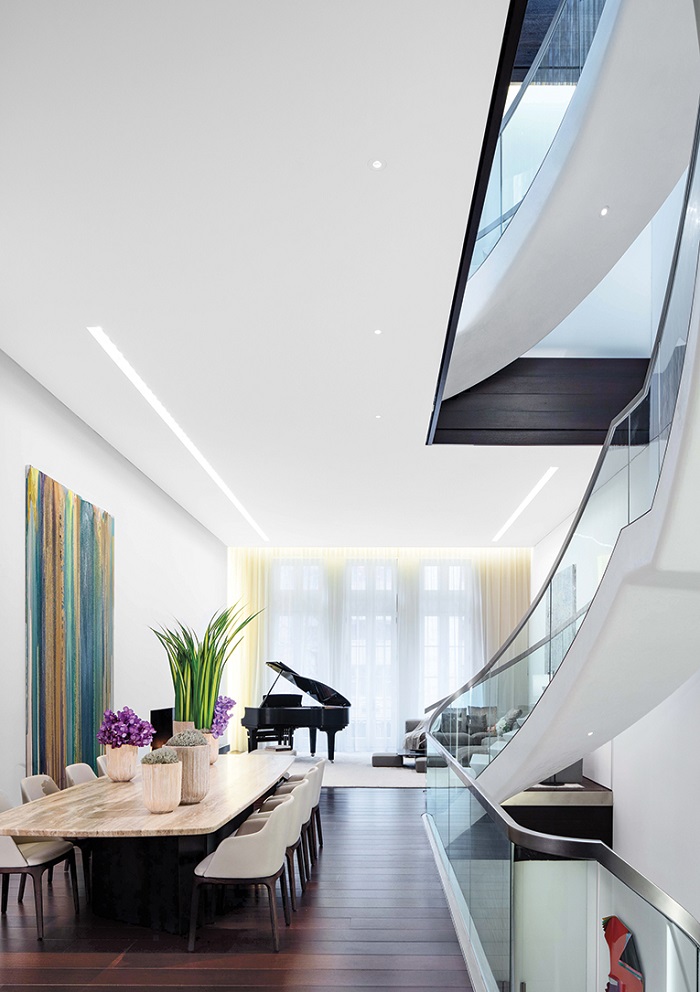 Kết nối tất cả mọi thứ là một bậc thang ngoằn ngoèo thanh tao ngoạn mục nổi lên. Các tấm kính được uốn cong nhiệt của lan can có chiều rộng 6 feet, đẩy giới hạn về khả năng đường cong và bị trói bằng băng chải bằng thép không rỉ. Các bước là đá cẩm thạch trắng kem từ Macedonia. Như một điểm đối lập, mang lại sự tràn ngập và chiều sâu của màu sắc cho sáng tác, mỗi lần hạ cánh được sắp xếp theo chiều dọc.