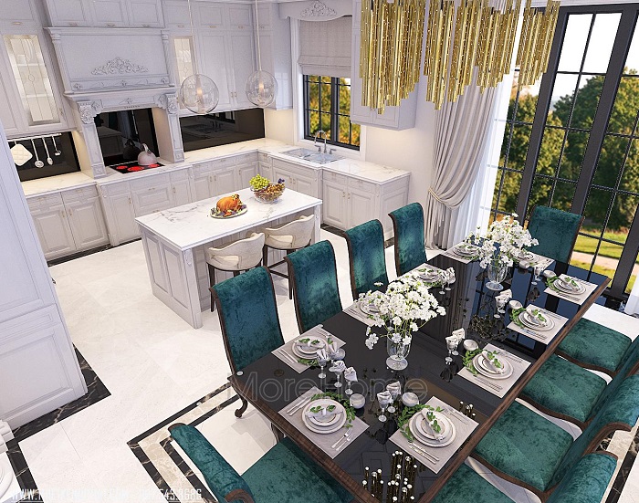 Phòng ăn mang phong cách quý tộc với bộ bàn ghế bọc nệm màu xanh nhung.
