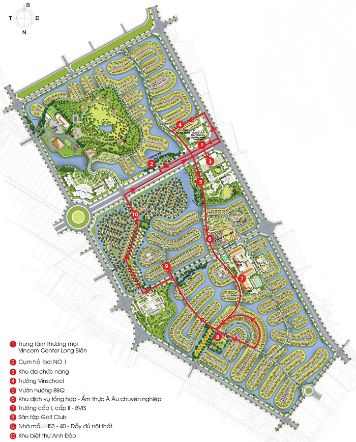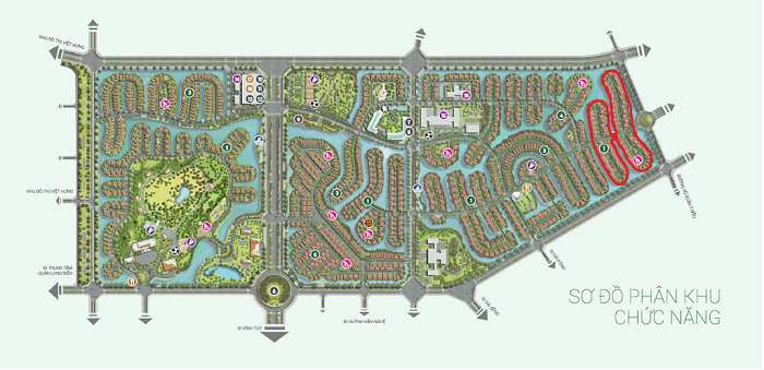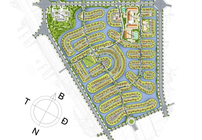 Các phân khu biệt thự nằm cách xa nhau để có thể đảm bảo tốt nhất về mật độ xây dựng. Nhìn vào sơ đồ, có thể thấy, mỗi tiểu khu đều có sông đào bao quanh uốn lượn, có nhiều cây xanh bố trí khắp nơi, mang đến một không gian sống trong lành và xanh mát.