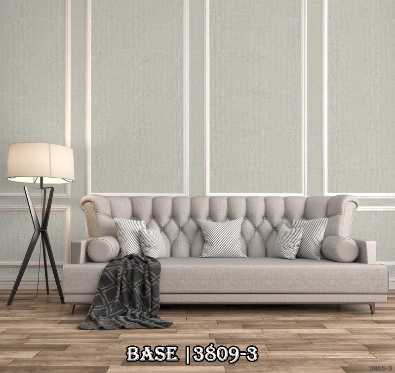 Không gian hiện đại và tinh tế được tạo ra bởi sự kết hợp của mẫu giấy dán tường màu xám 3809-3 và phào chỉ vuông.
