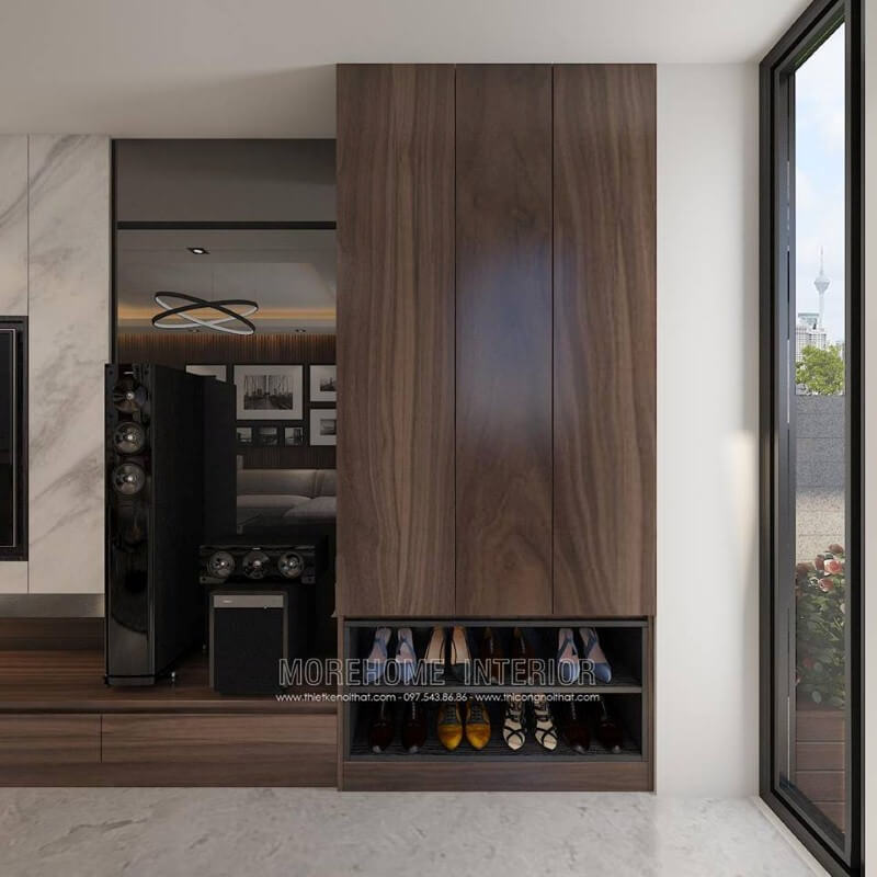 Kệ hiện đại để giày, đồ ngay từ cửa chính là một trong những giải pháp khá thông minh đảm bảo khá nhiều công năng ngay từ khi bước vào ngôi nhà.